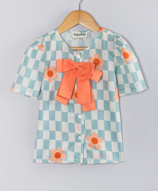 Checked & Floral Printed Bow Applique Detailed Shirt Style Top - Blue