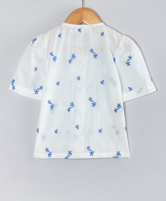 Floral Embroidered Bow Applique Detailed Shirt Style Top - White