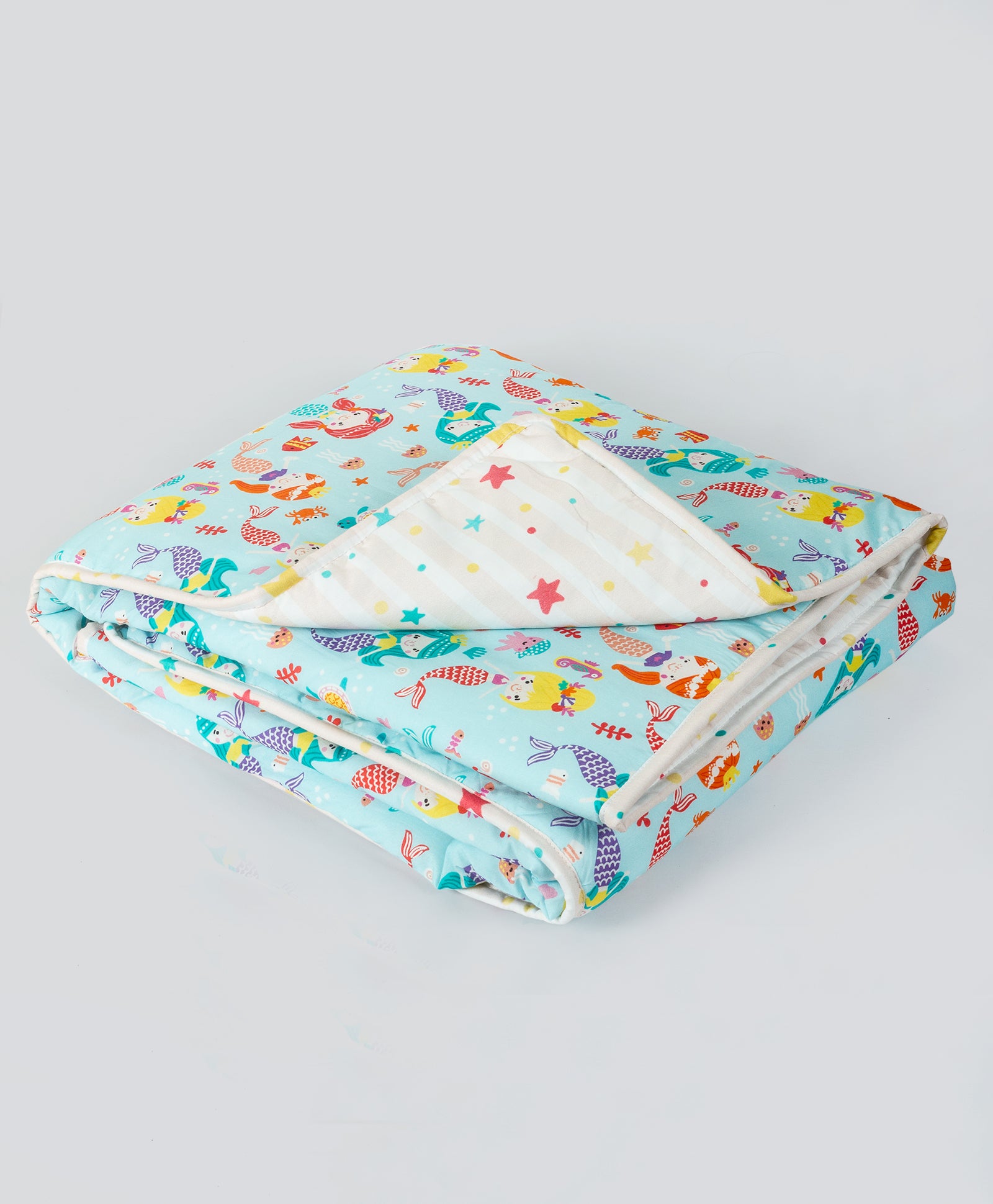 AQUA MERMAID PRINT AC QUILT WITH PINK STRIPED STAR LINING PRINT.