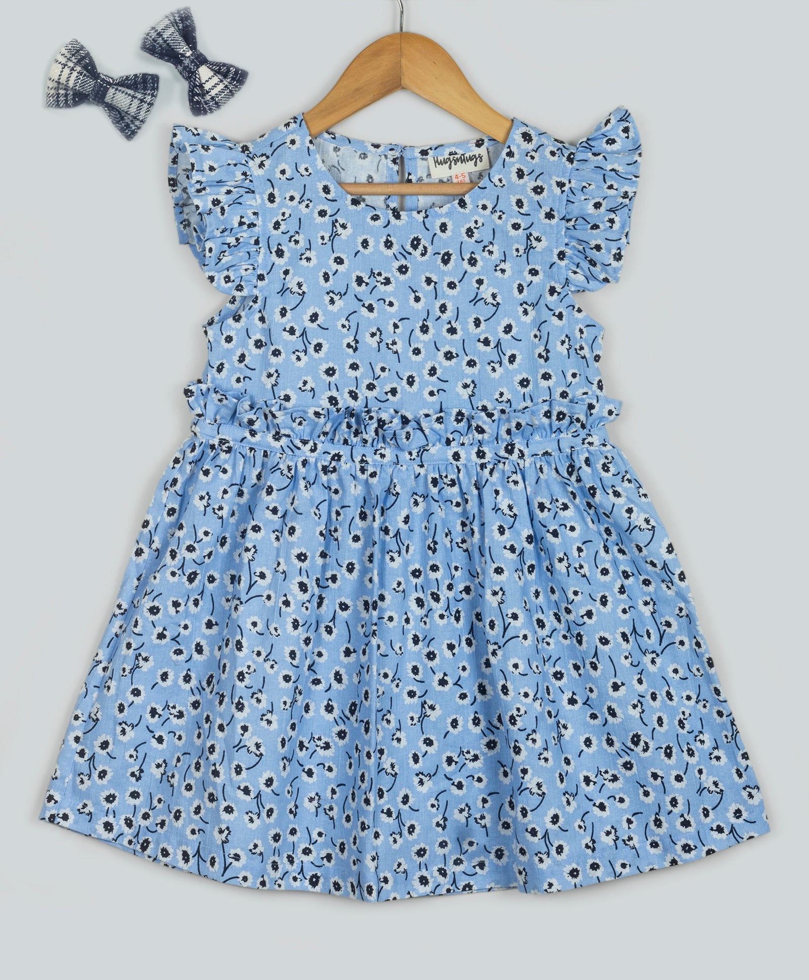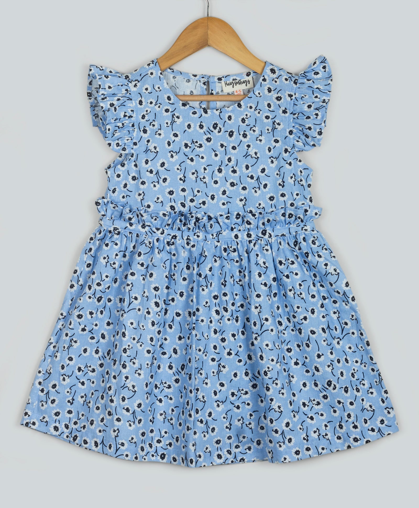 BLUE DITSY FLORAL PRINT DRESS WITH PLEATS AT FRONT WAIST. ROUND NECK AND FRILLS AT SHOULDERS