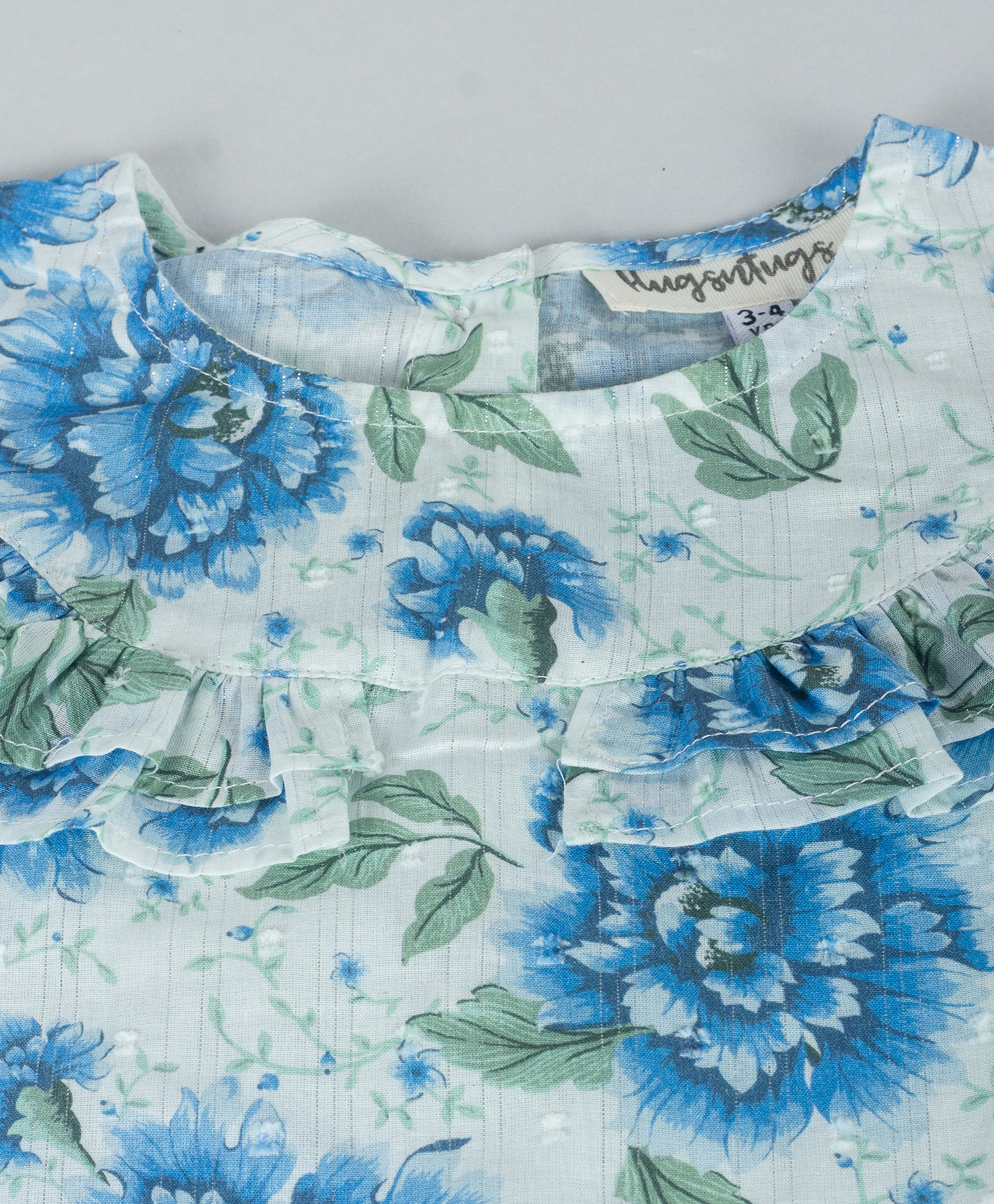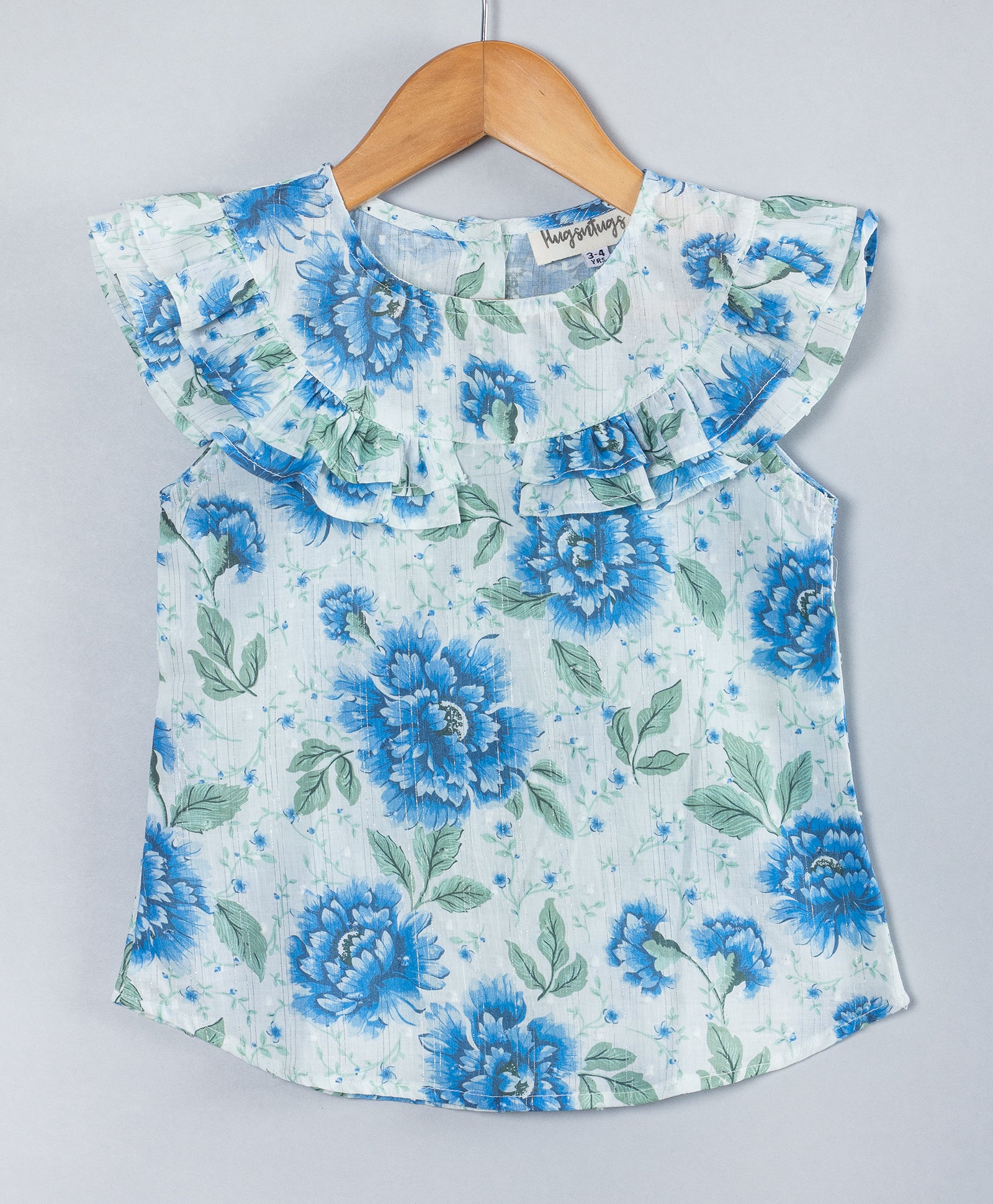 BLUE FLORAL PRINT TOP WITH FRILLS ALONG YOKE