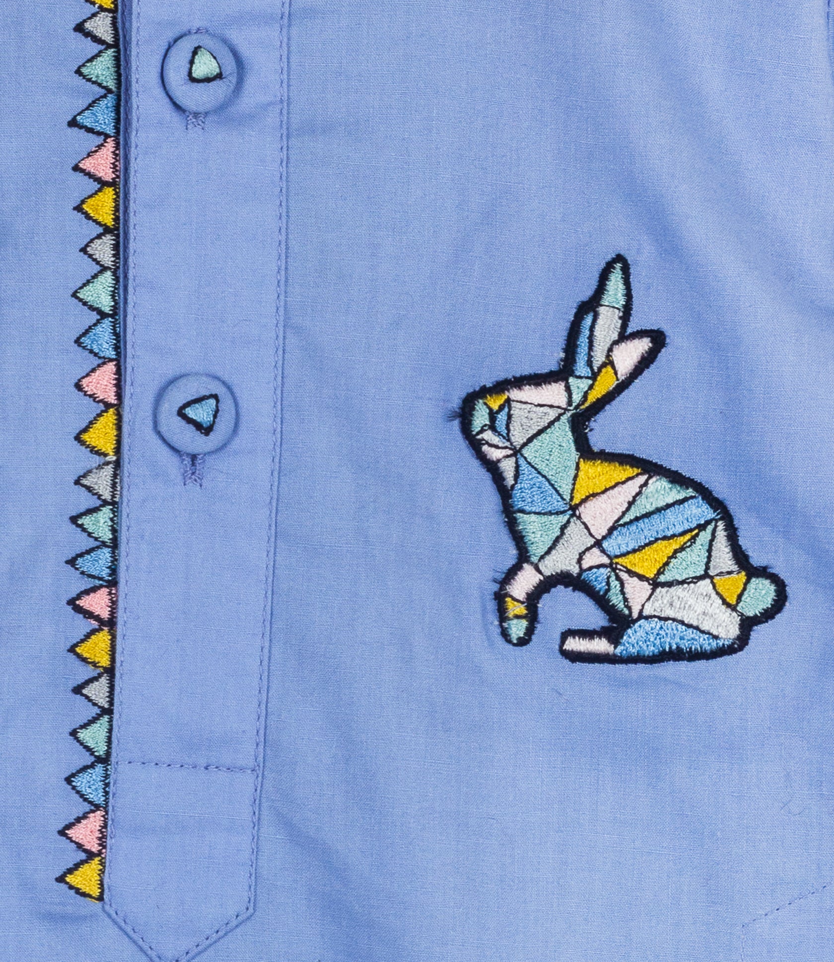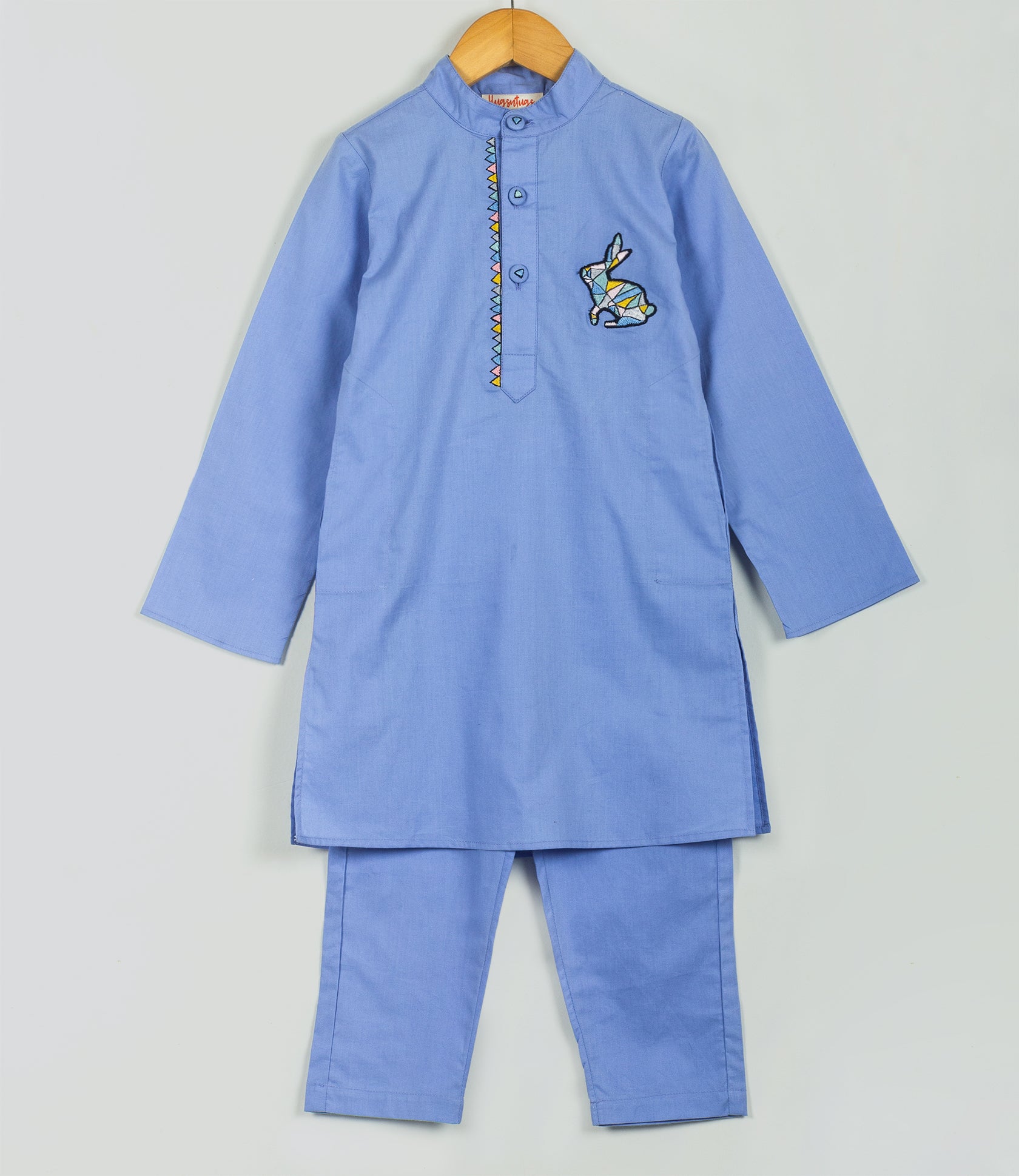 BLUE KURTA SET WITH POLYGON RABBIT EMBROIDERY ON THE FRONT SIDE AND ALONG THE PLACKET