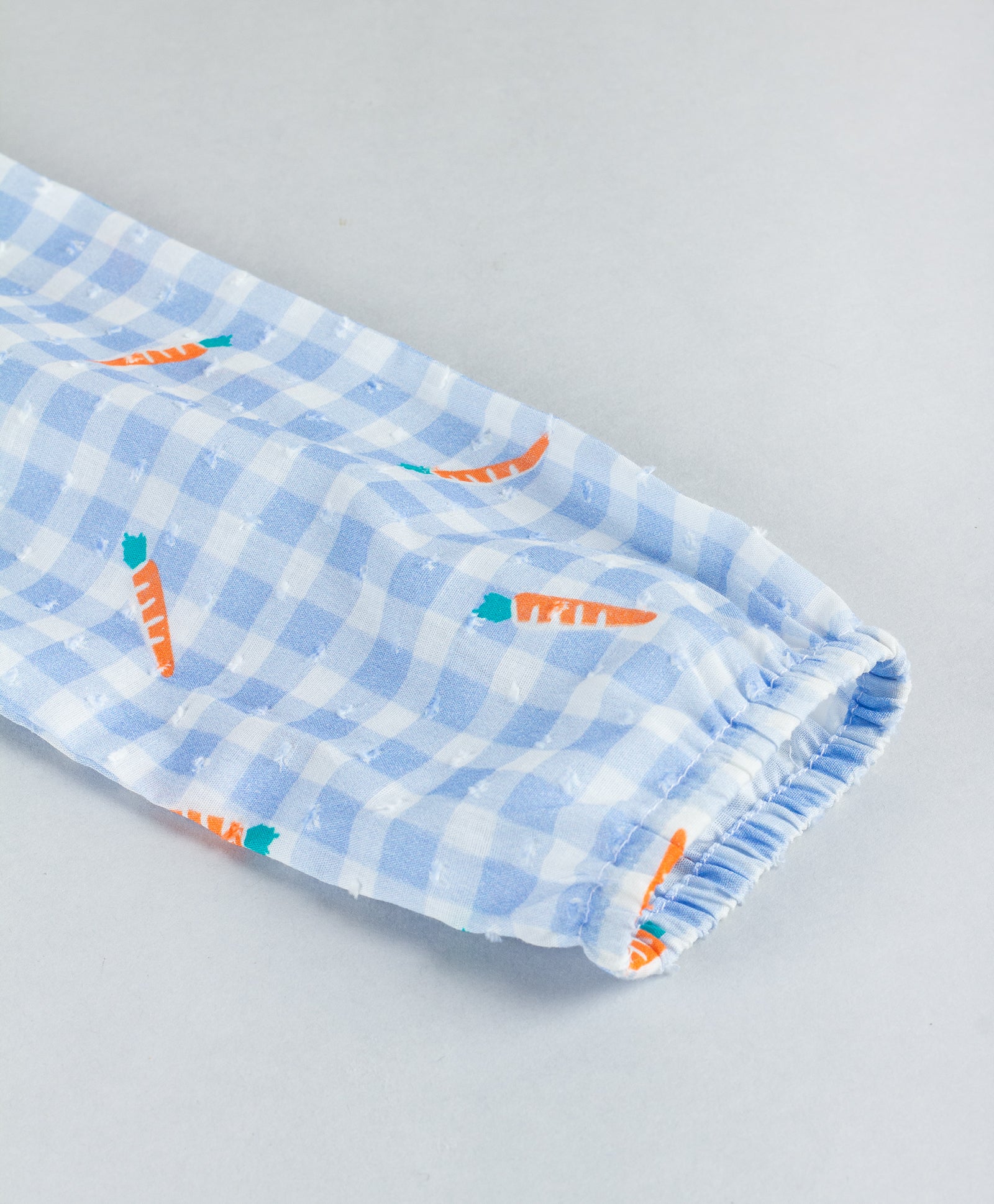 BLUE SMALL CHECK PRINT TOP WITH CARROT PRINT