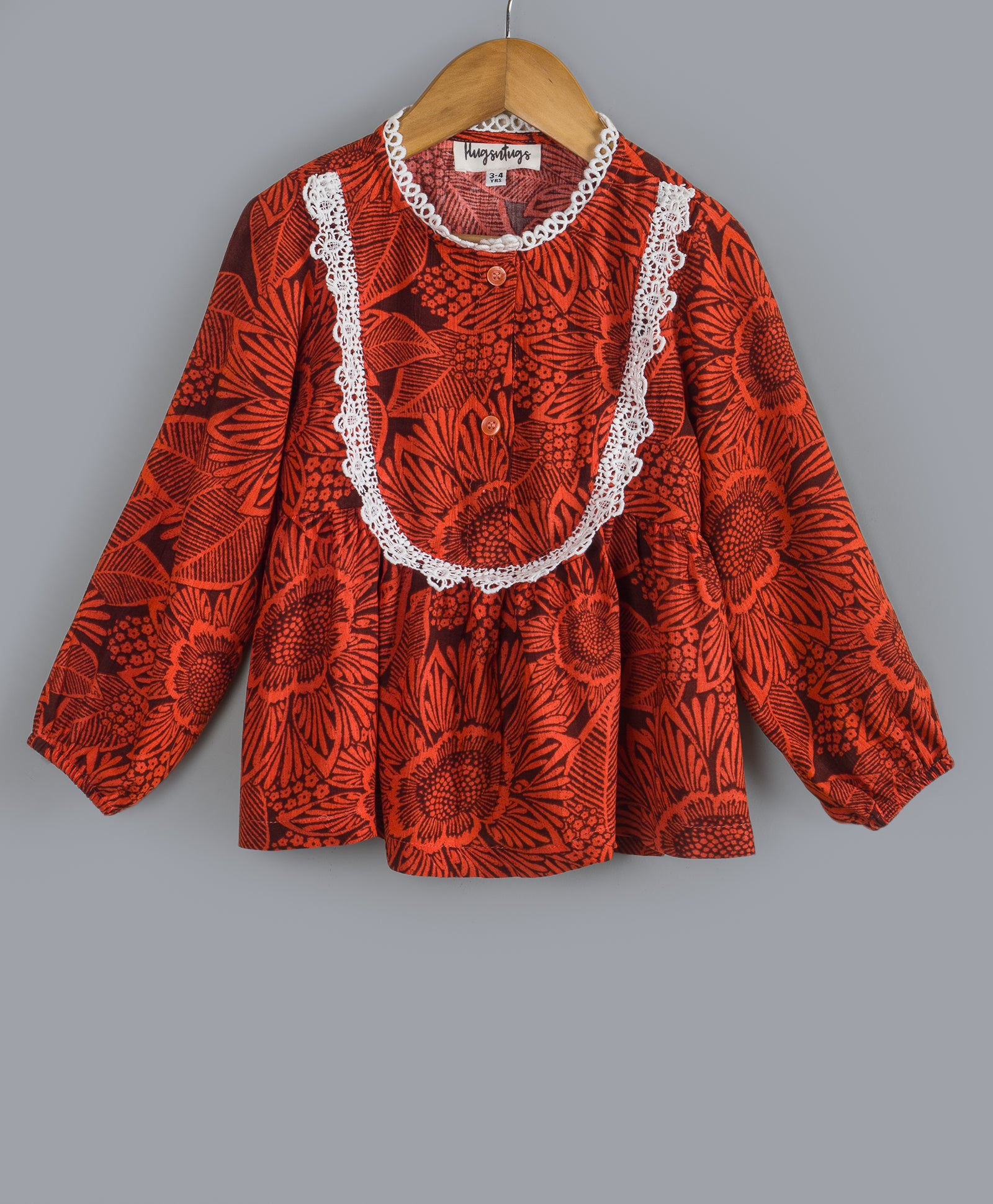 BRICK RED SELF PRINT TOP WITH CONTRAST LACE ALONG YOKE