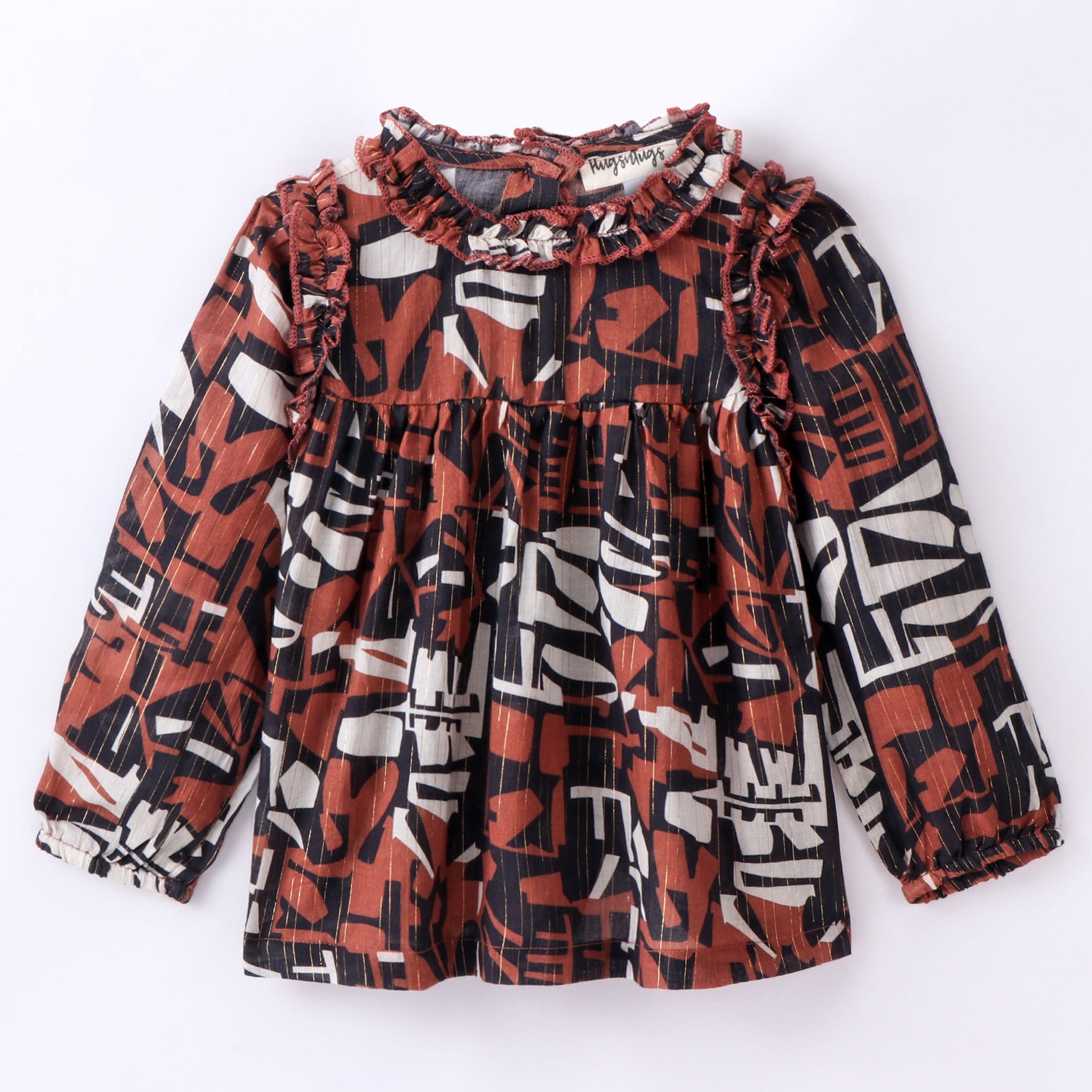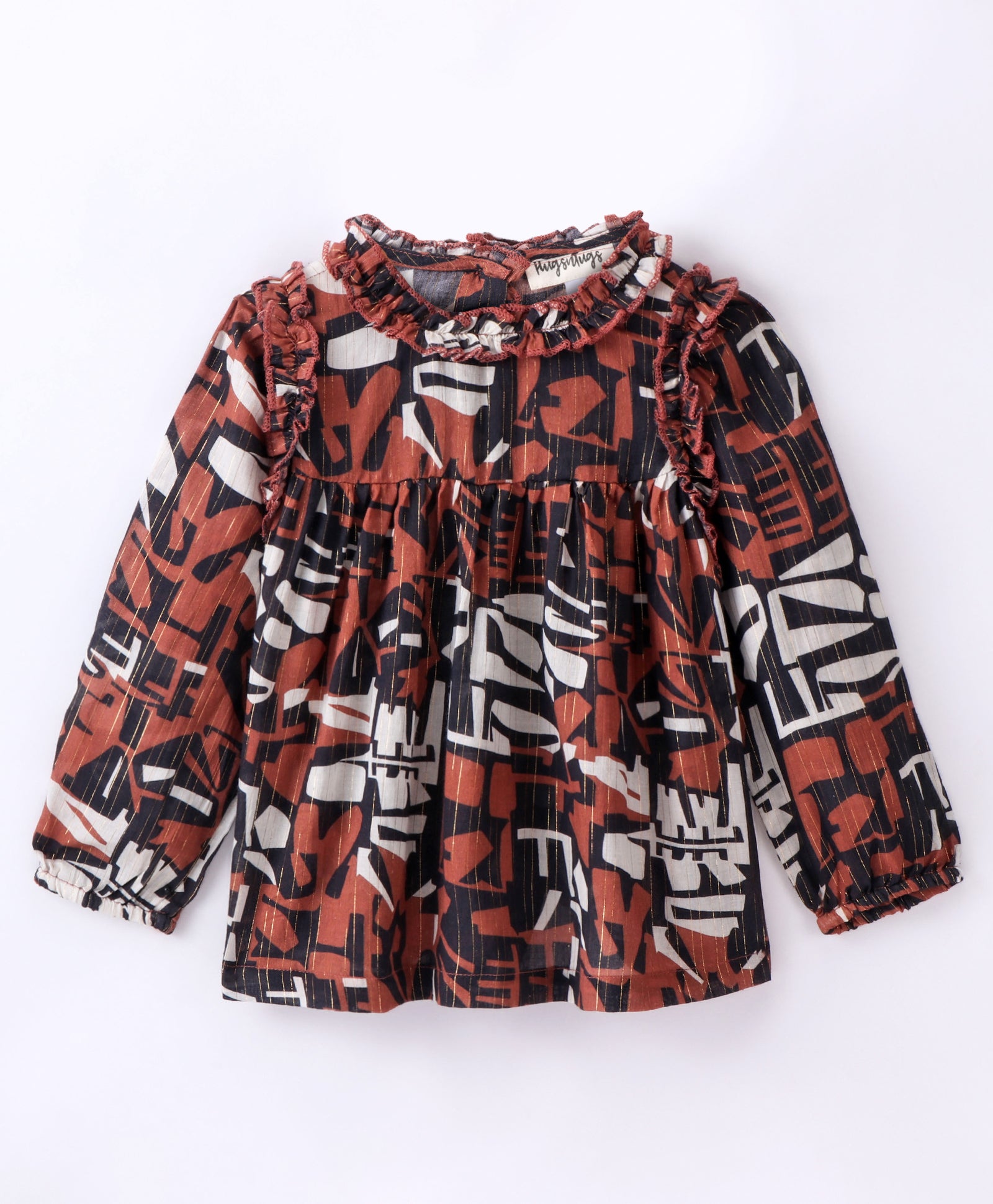 Full Sleeve Seamless Alphabets Printed & Swiss Dobby Work Detailed & Lurex Striped Ruffled Top - Brown