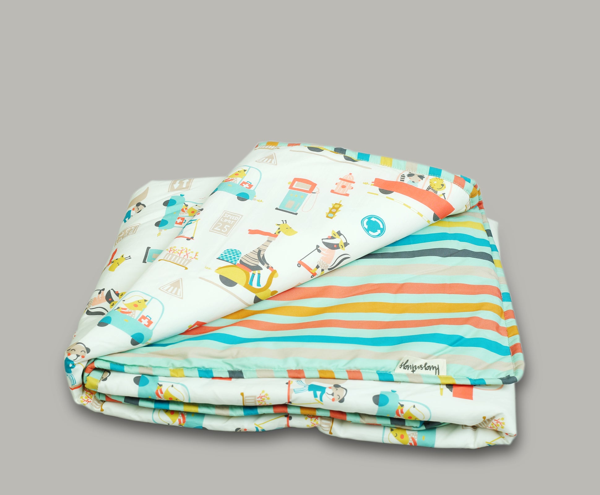 CAR AND STRIPE PRINT COT SET INCLUDES 1 SHEET + 1 HEAD PILLOW + 1 AC QUILT COT SIZE + 2 BOLSTER PILLOWS WITH REMOVABLE COVERS.