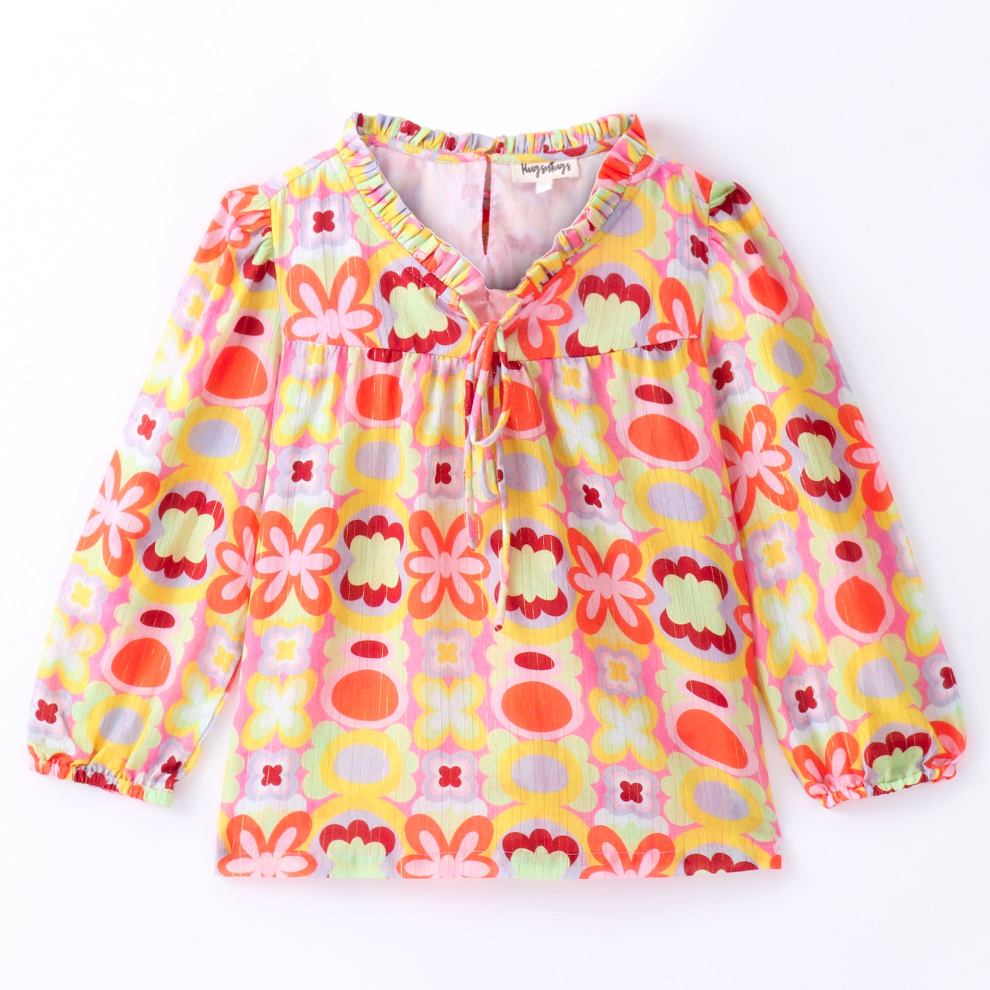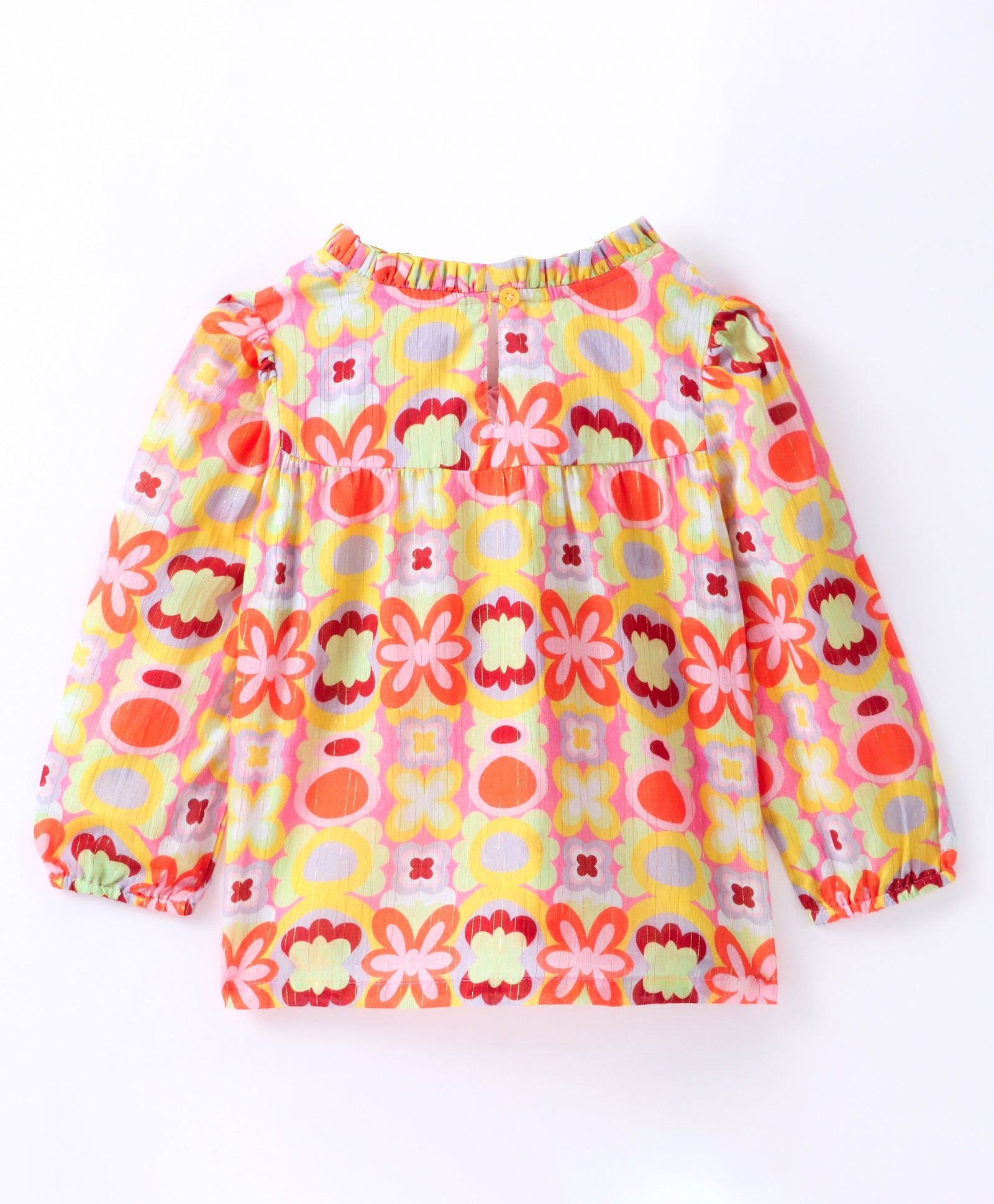 Full Sleeve Seamless Botanical Flowers Printed & Pleats Detailed & Lurex Striped Top - Yellow