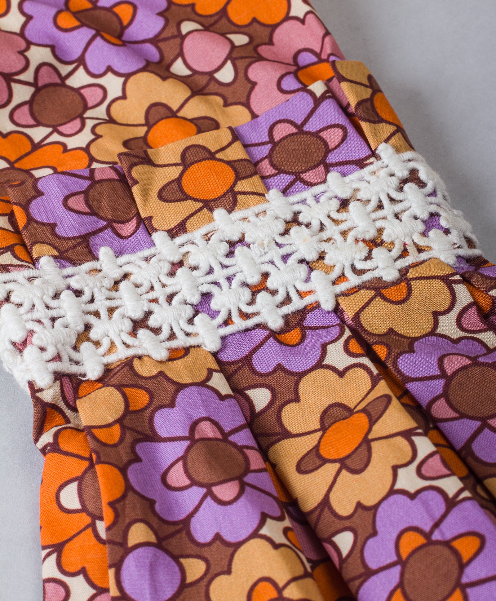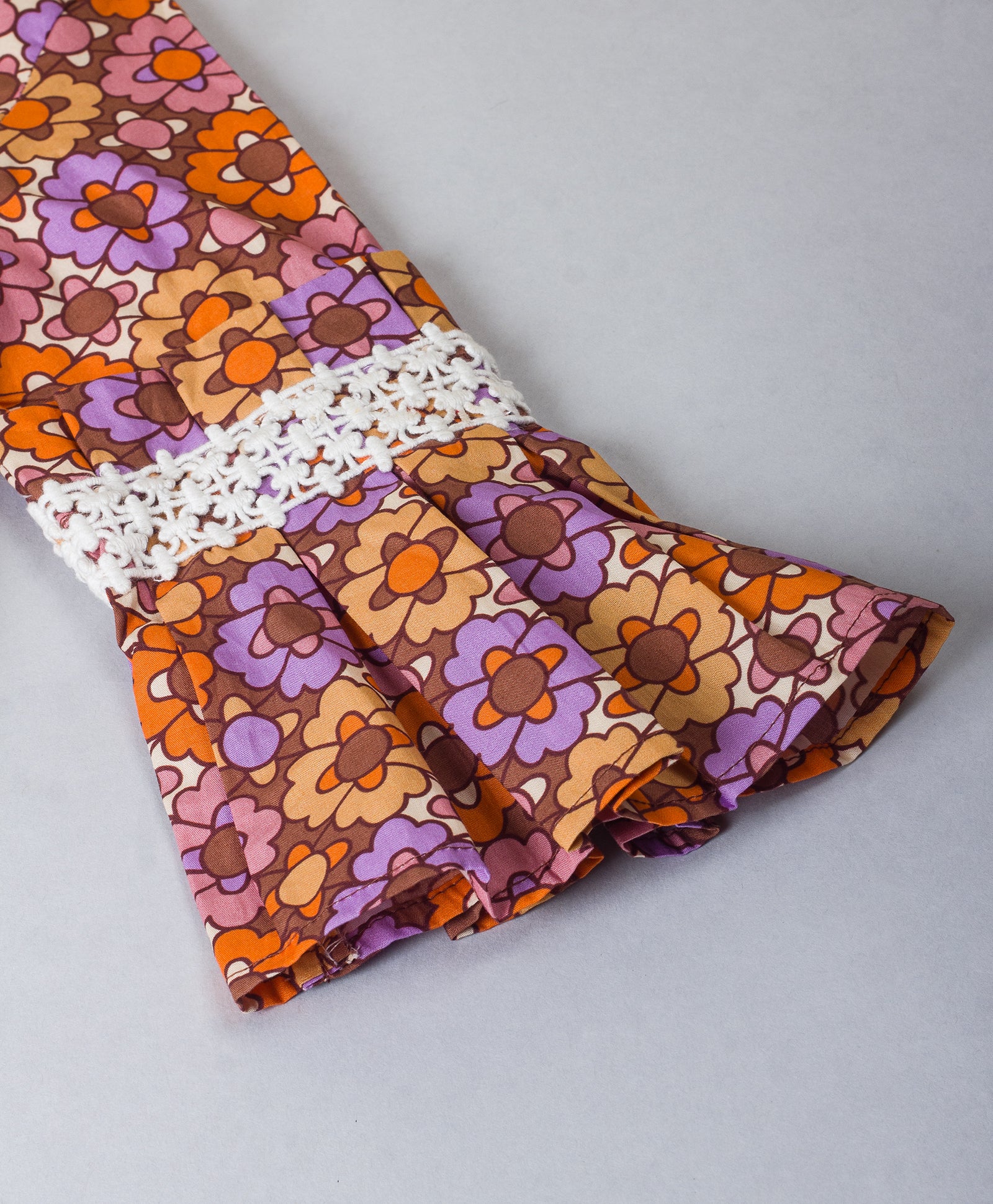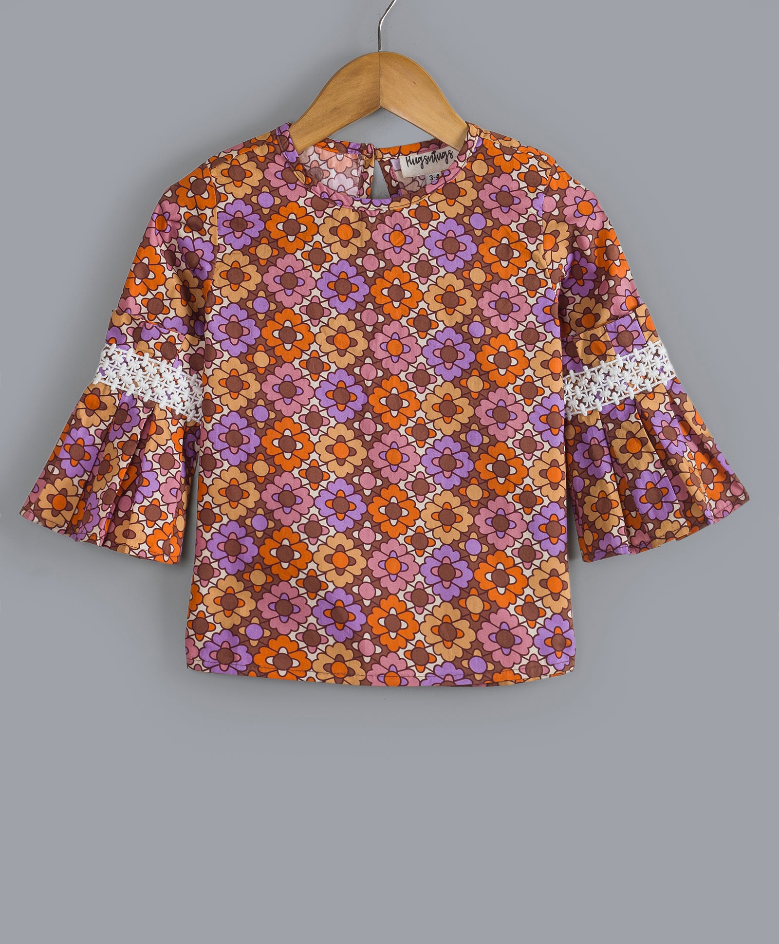 GEOMETRIC FLORAL PRINT TOP WITH BELL SLEEVES AND CONTRAST LACE ON SLEEVES