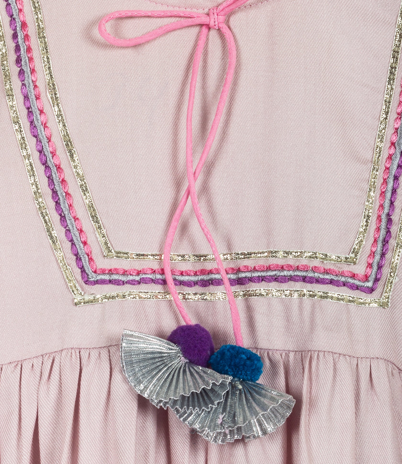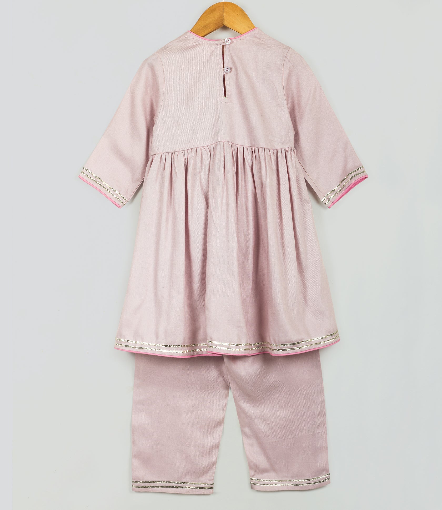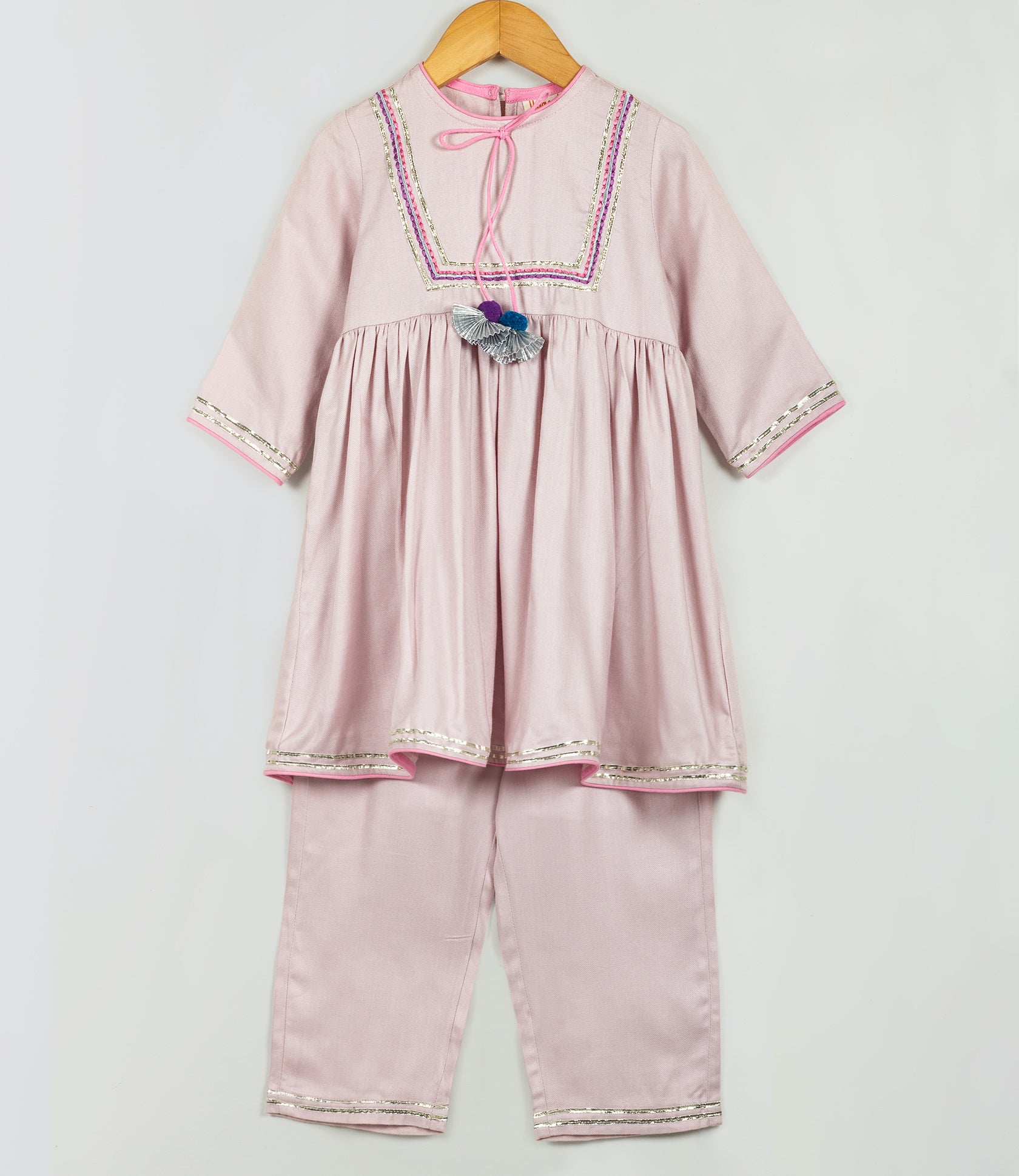 LIGHT PINK KURTA SET WITH CONTRAST TASSLES AND THREAD WORK EMBROIDERY ON THE YOKE