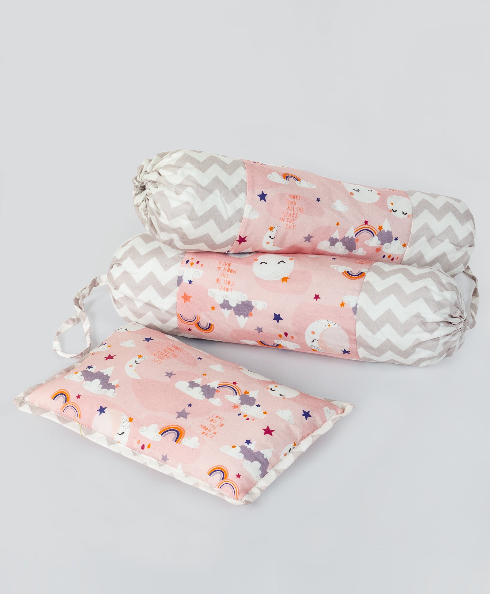 MOON AND CLOUD PRINT COT SET INCLUDES 1 SHEET + 1 HEAD PILLOW + 1 AC QUILT COT SIZE + 2 BOLSTER PILLOWS WITH REMOVABLE COVERS.