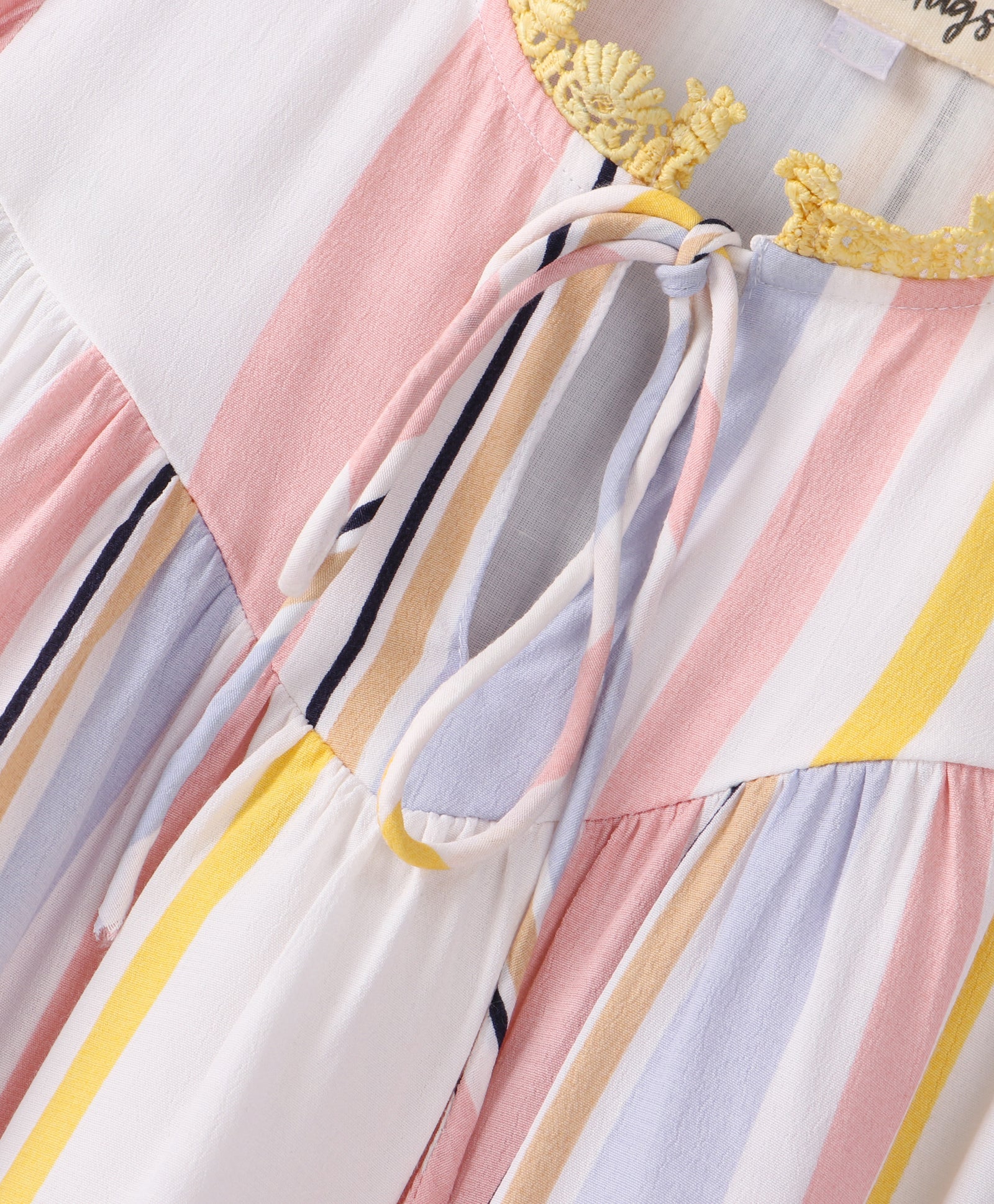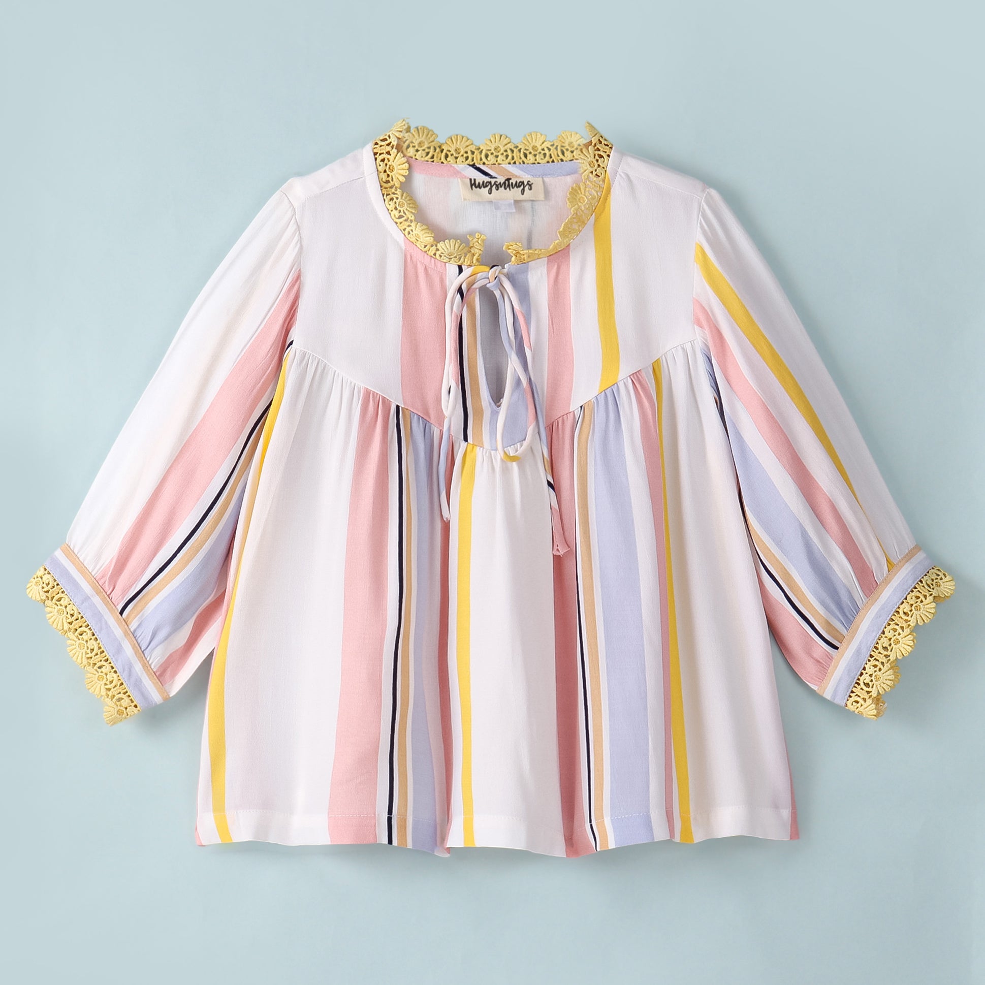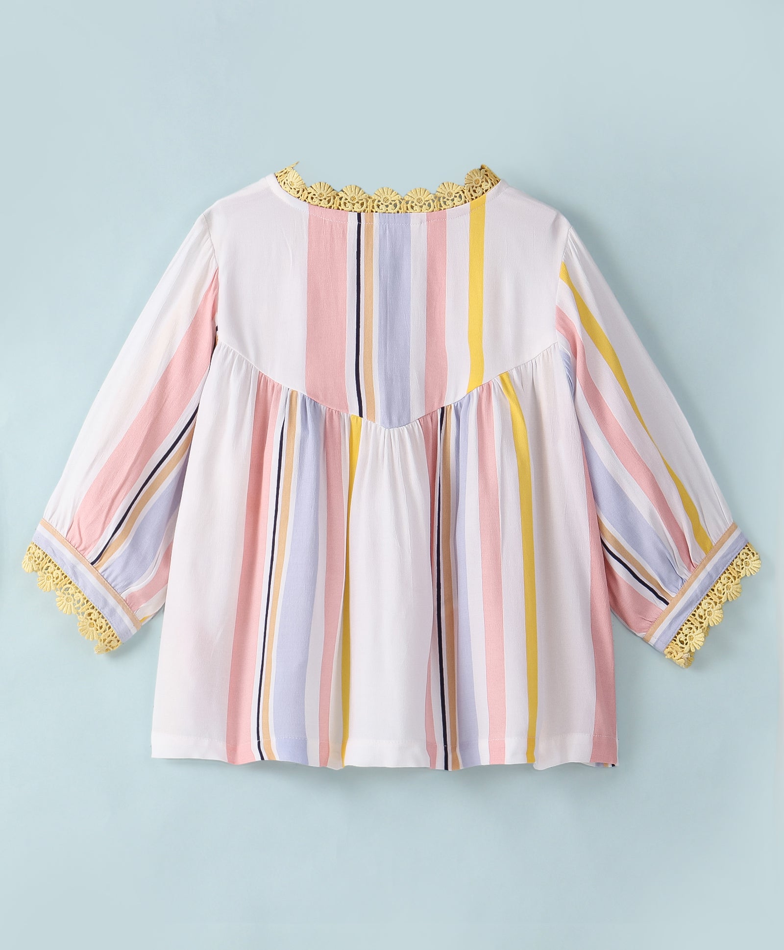 MULTI STRIPE PRINT WITH CONTRAST LACE AT NECK AND SLEEVES- WHT/PINK