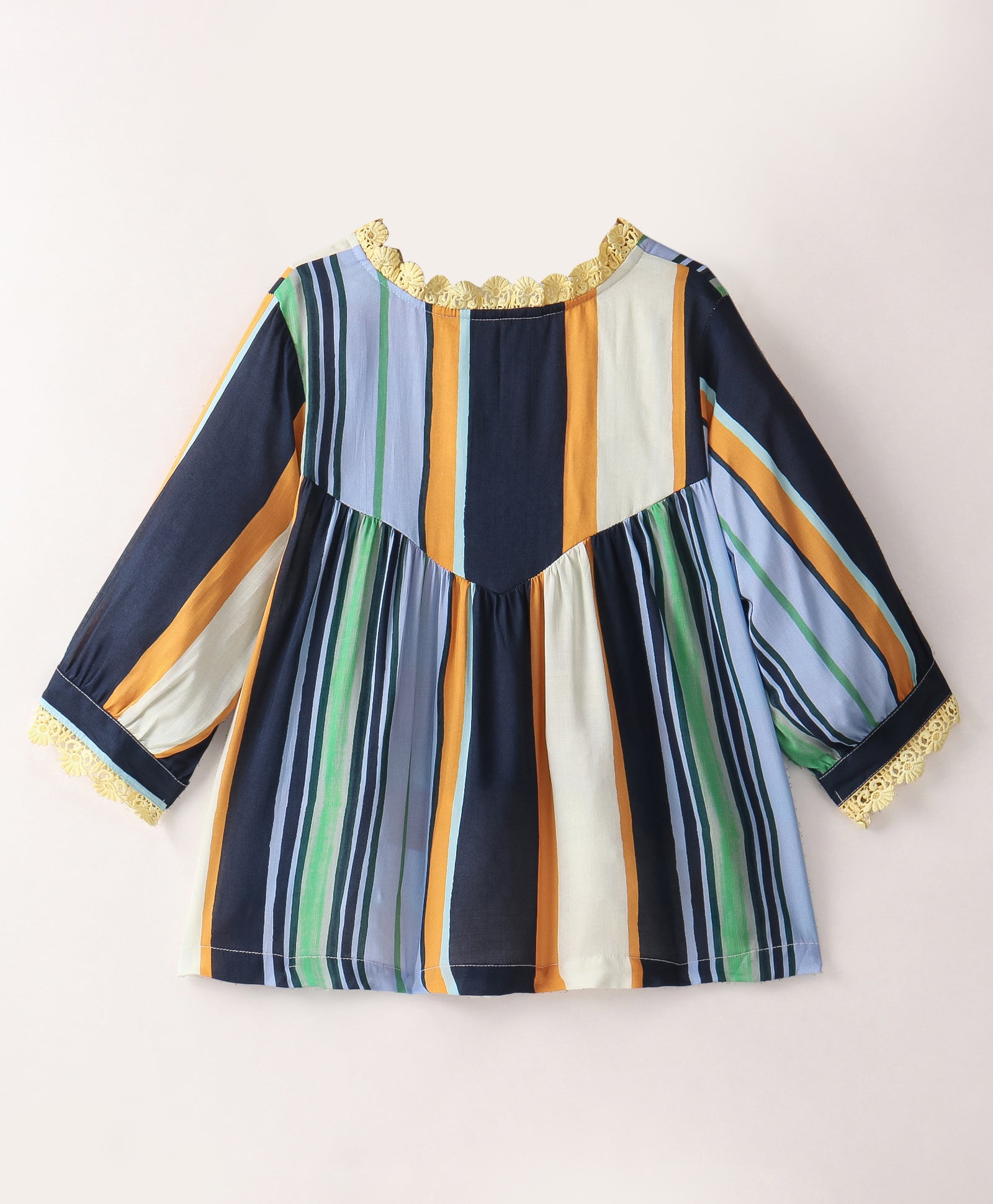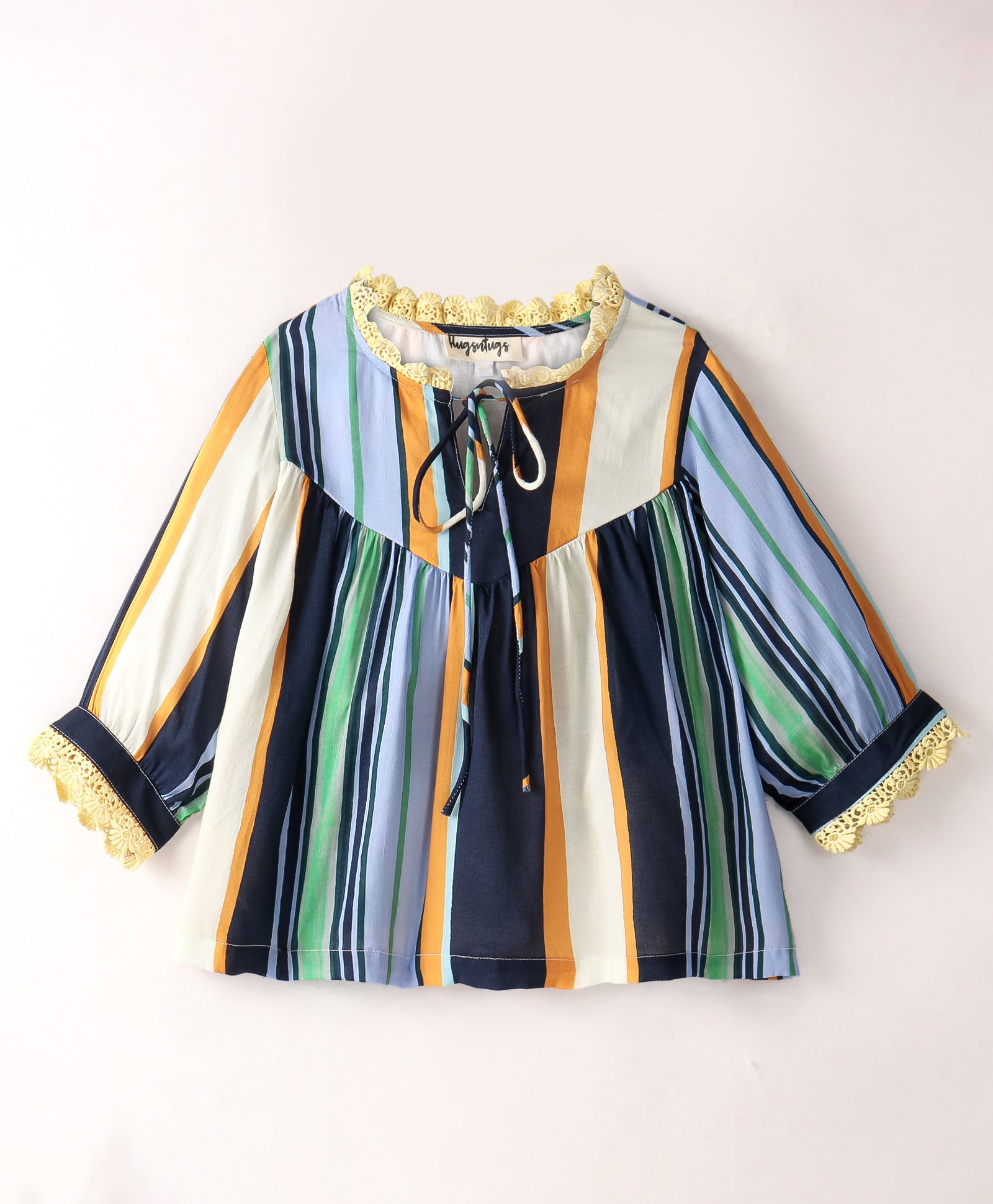 MULTI STRIPE TOP WITH CONTRAST LACE AT NECK AND SLEEVE ENDS - BLUE