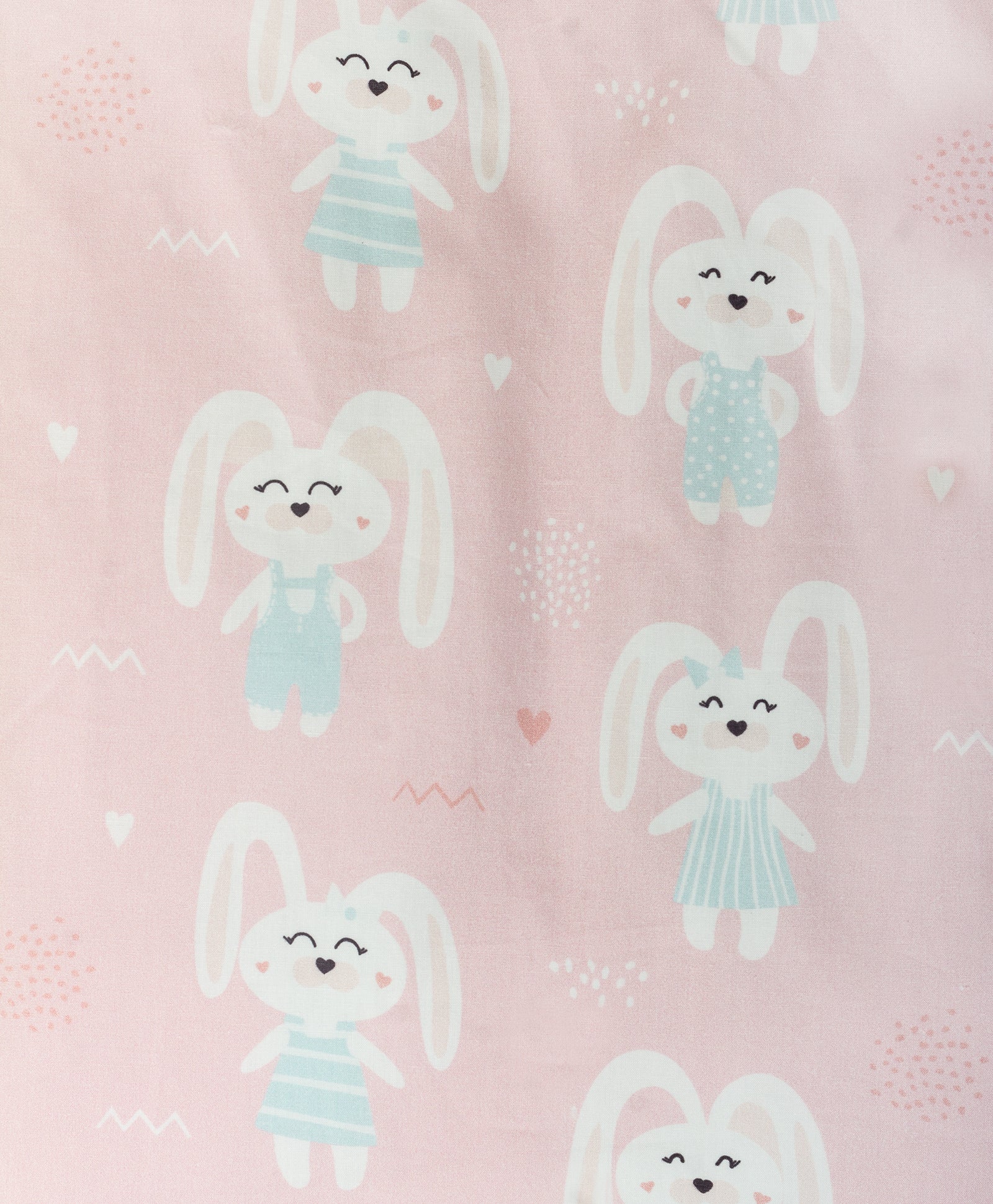 PINK BUNNY PRINT AC QUILT WITH BLUE CHEVRON LINING PRNT.
