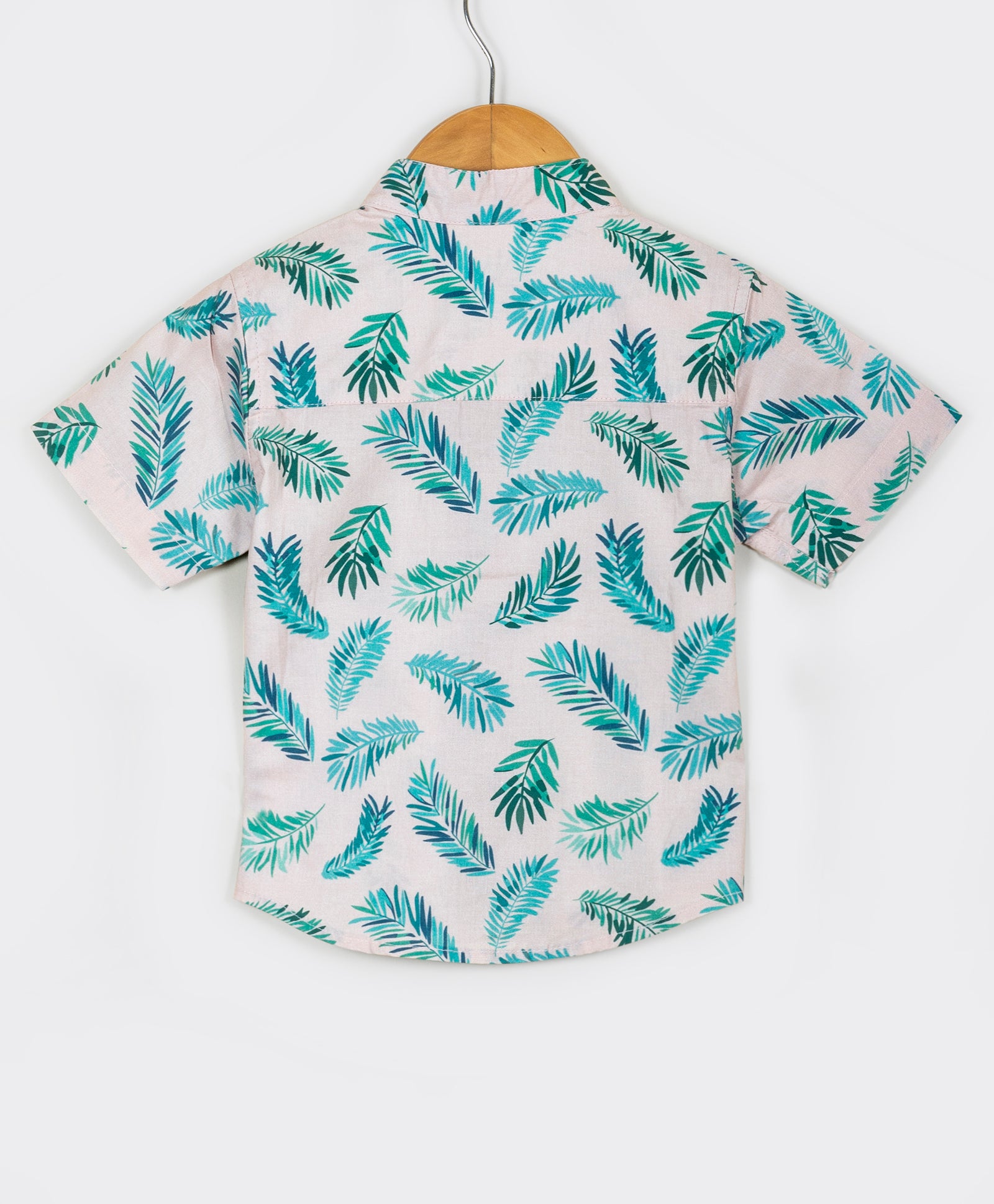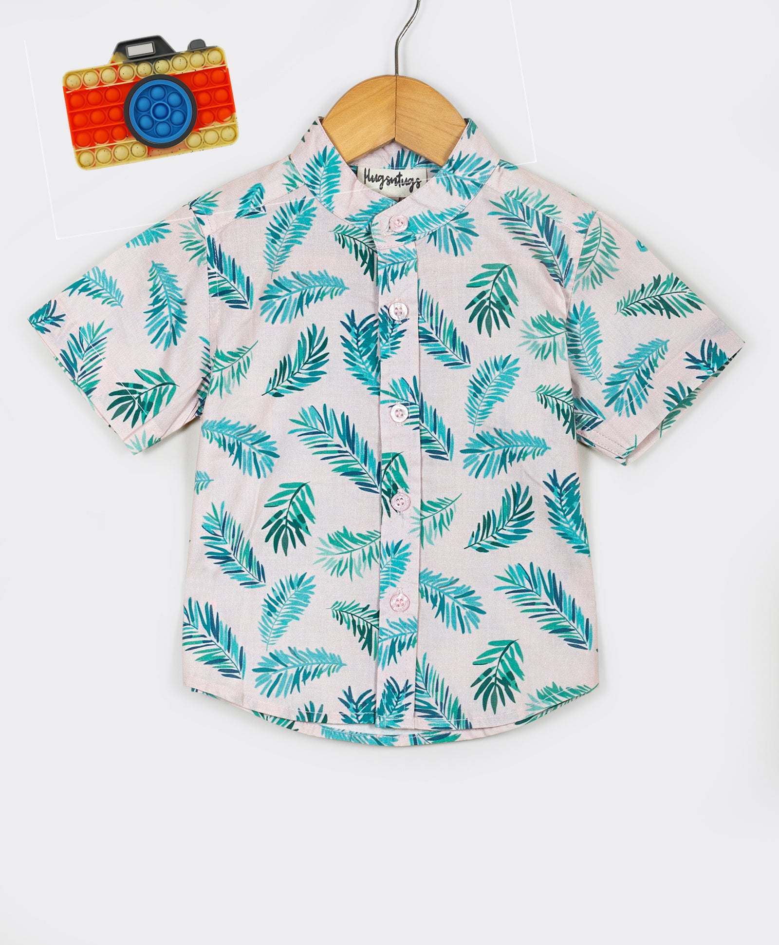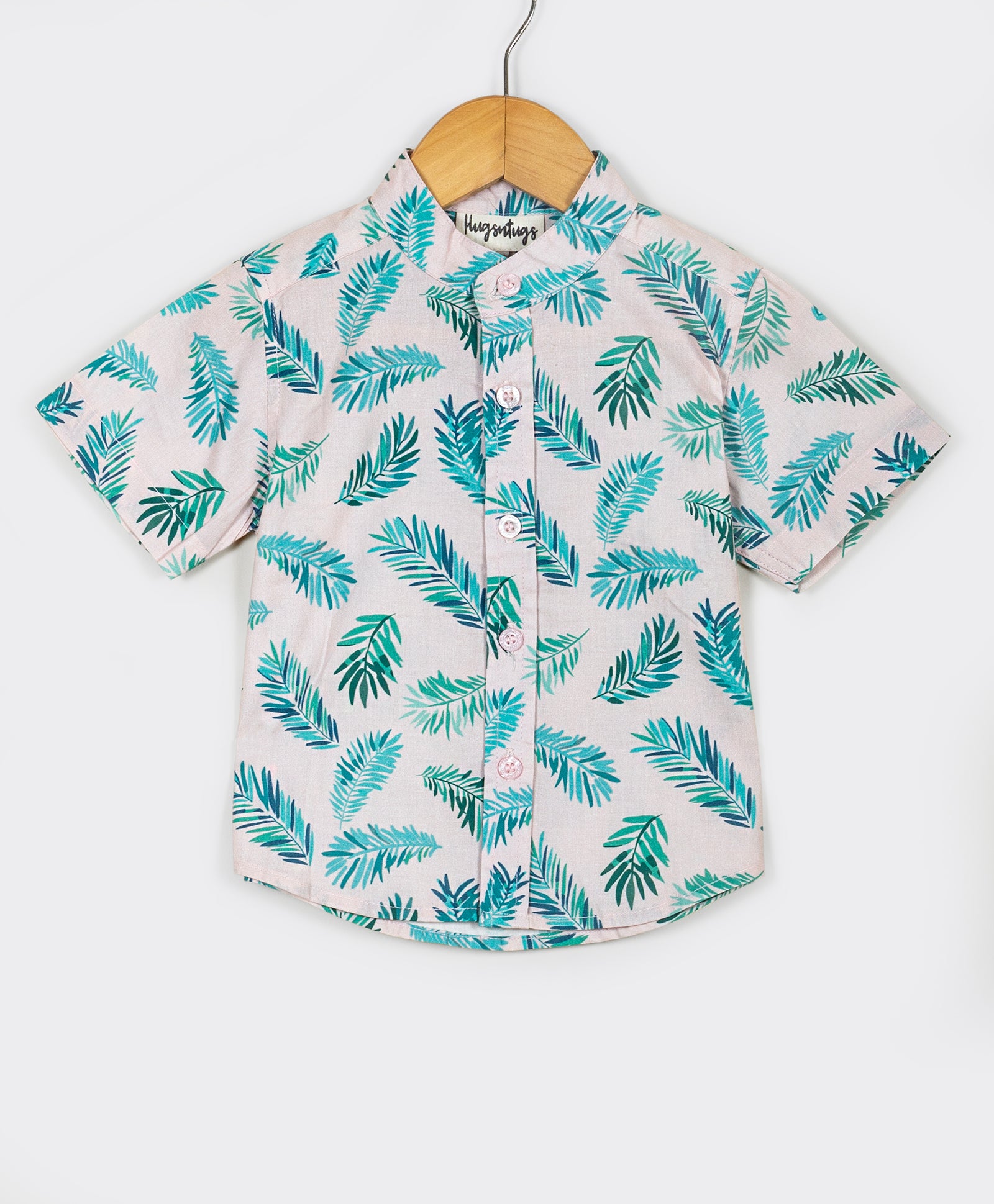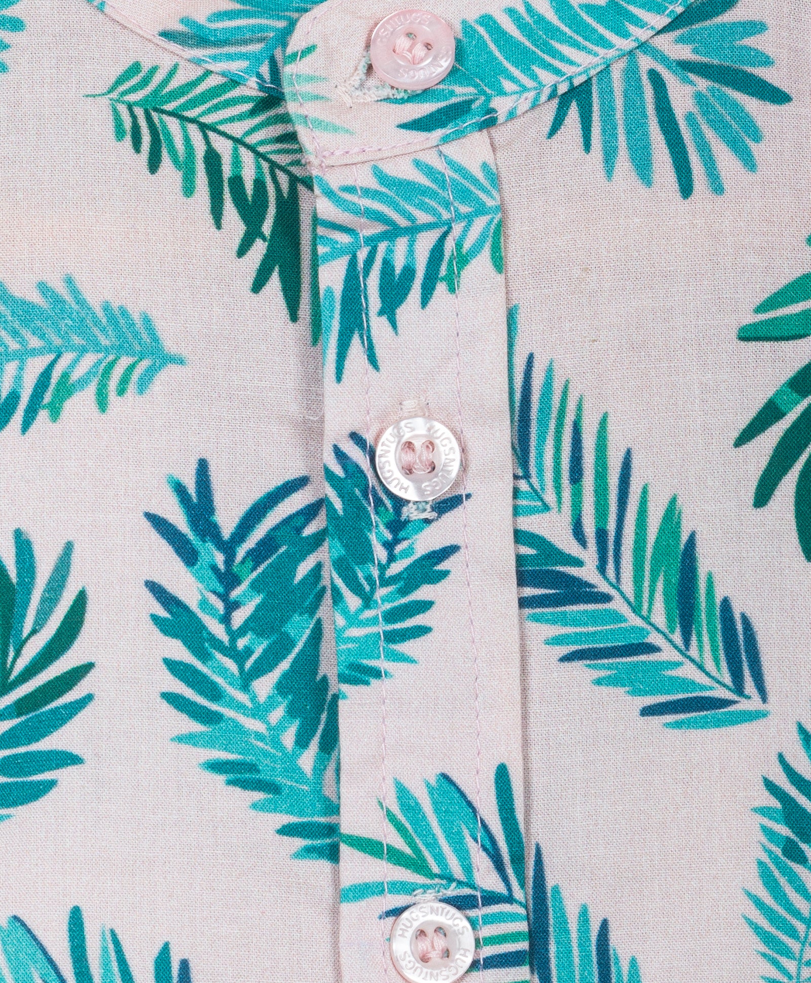 Pink all over palm print shirt with short sleeves and mandarin collars