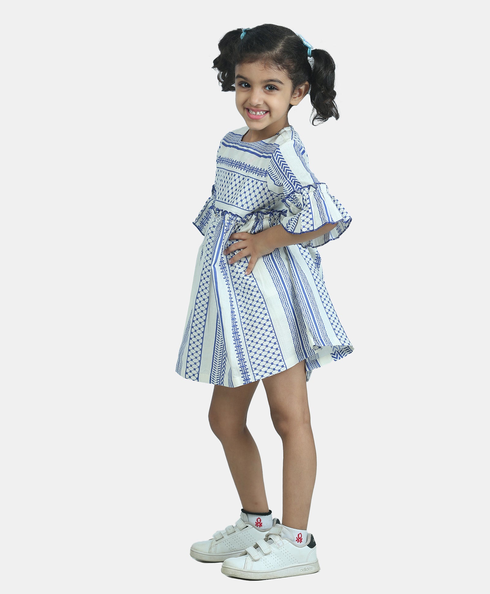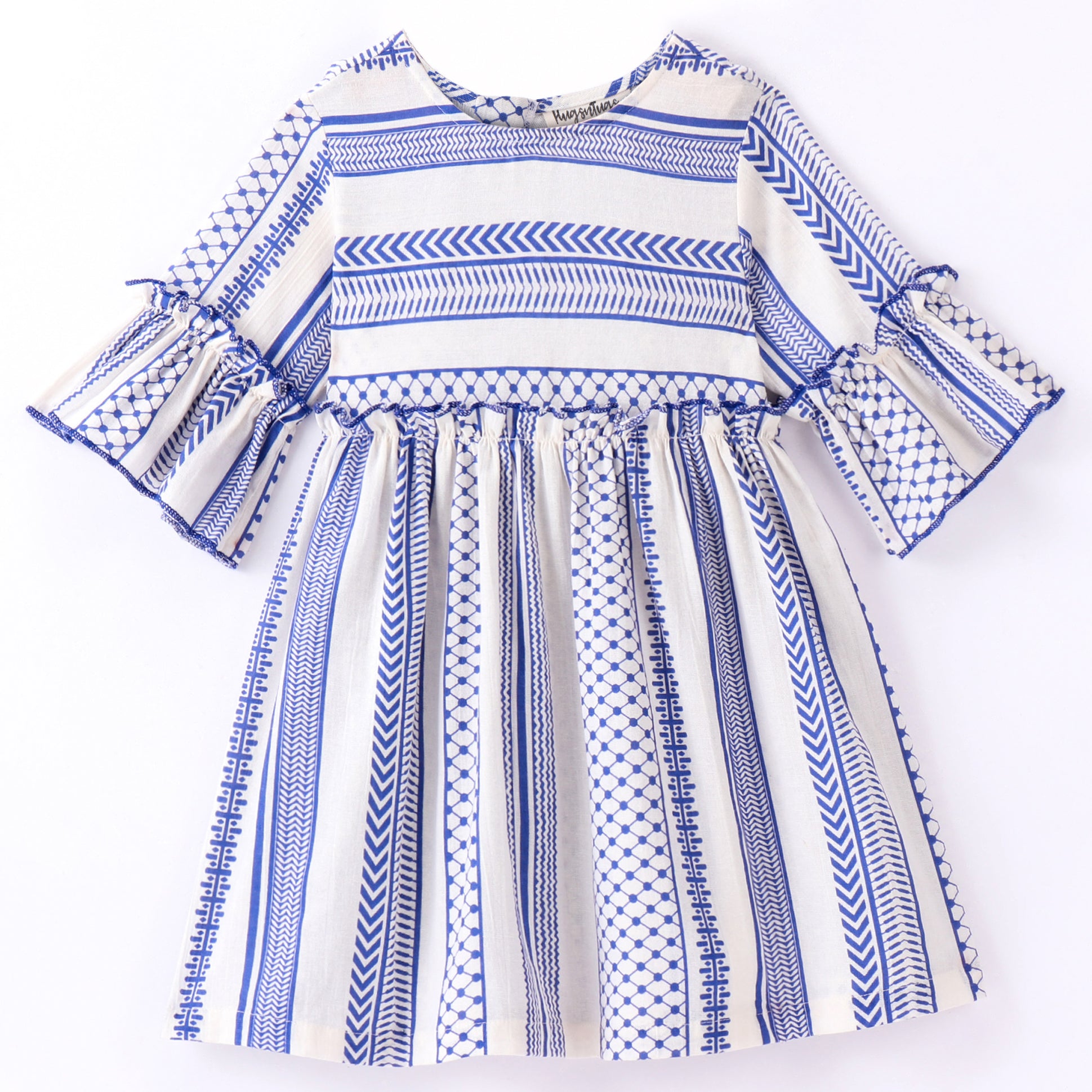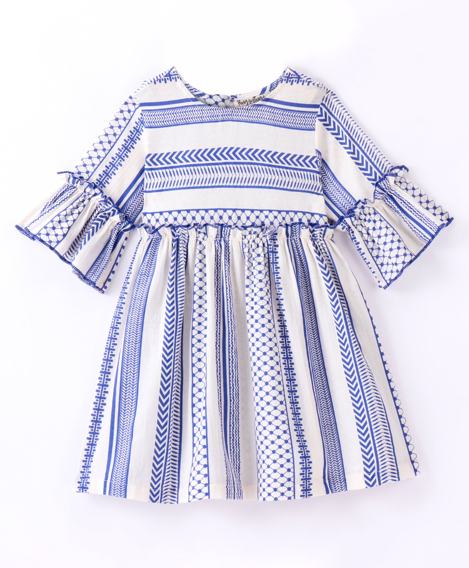 Three Fourth Sleeves Striped Pattern Aztec Bands Designed Fit & Flare Dress - Navy Blue & White