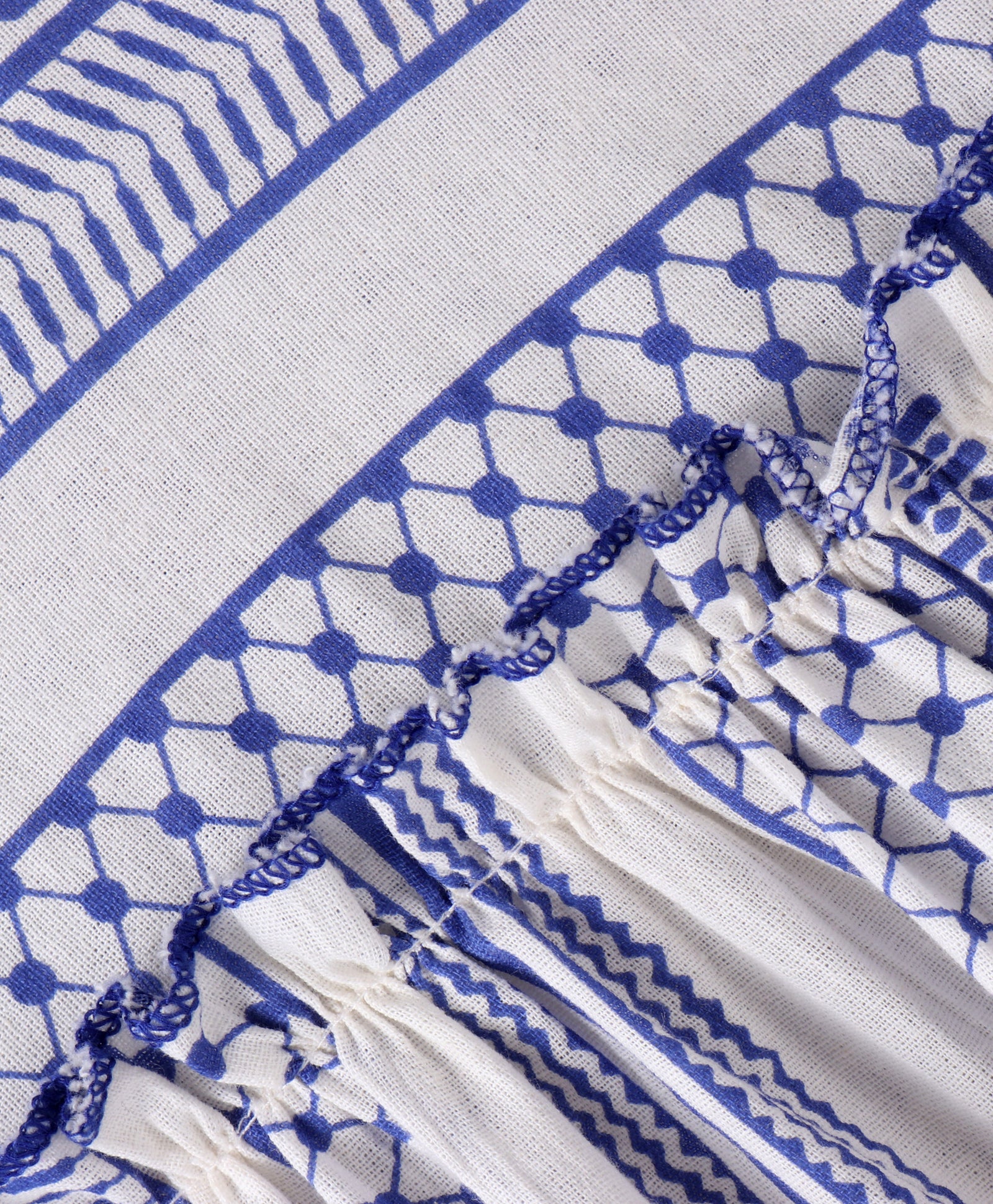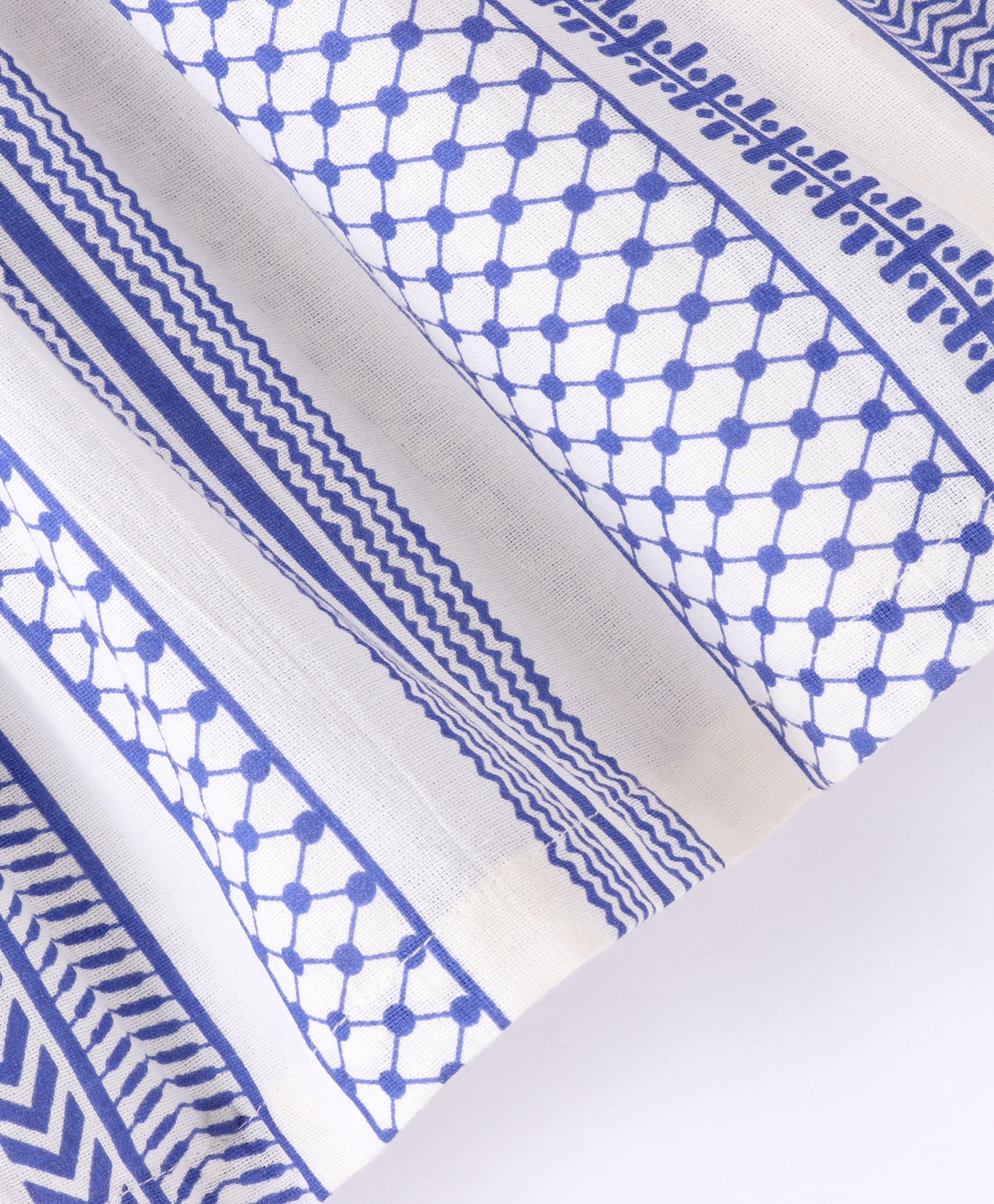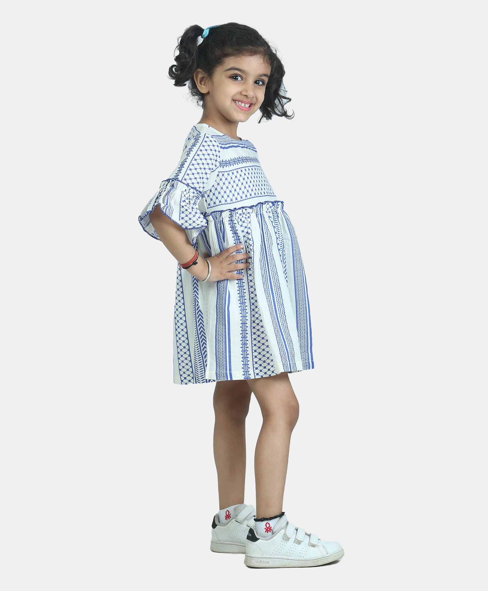 Three Fourth Sleeves Striped Pattern Aztec Bands Designed Fit & Flare Dress - Navy Blue & White