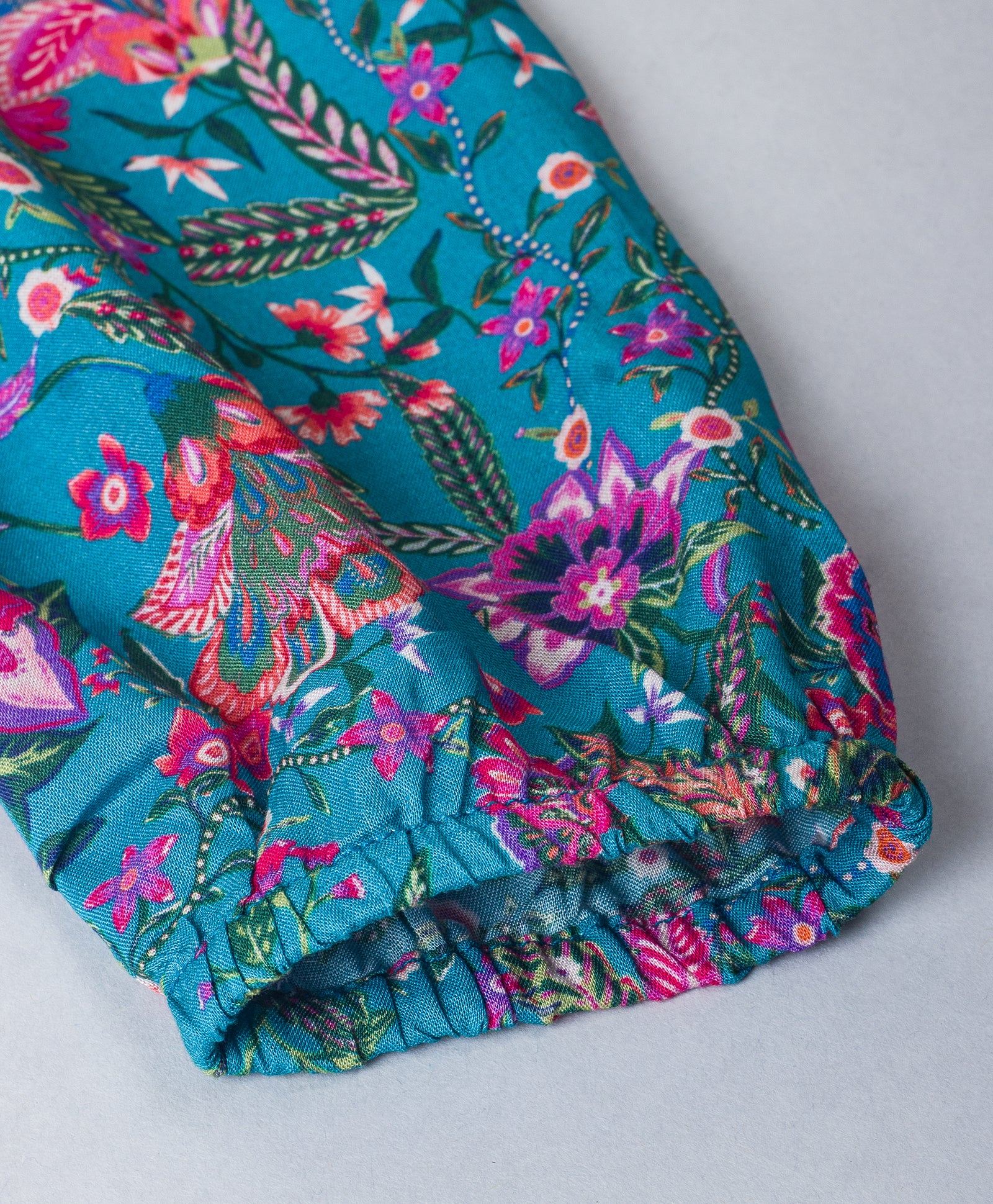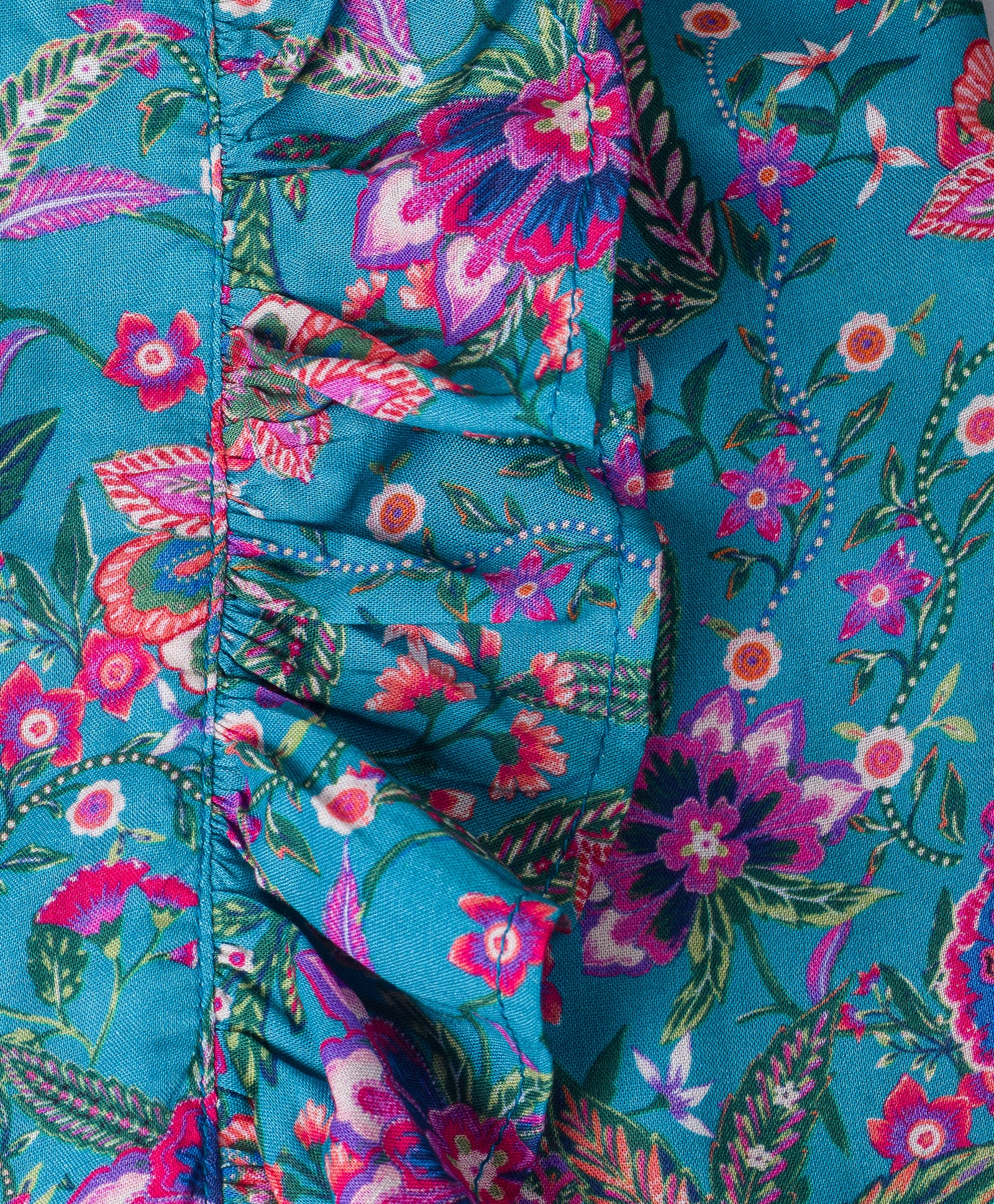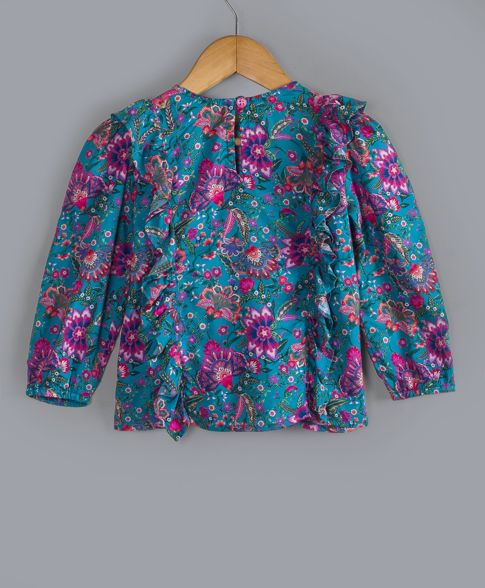 TURQ AND PURPLE FLORAL PRINT TOP WITH FRILLS ON THE FRONT SIDES