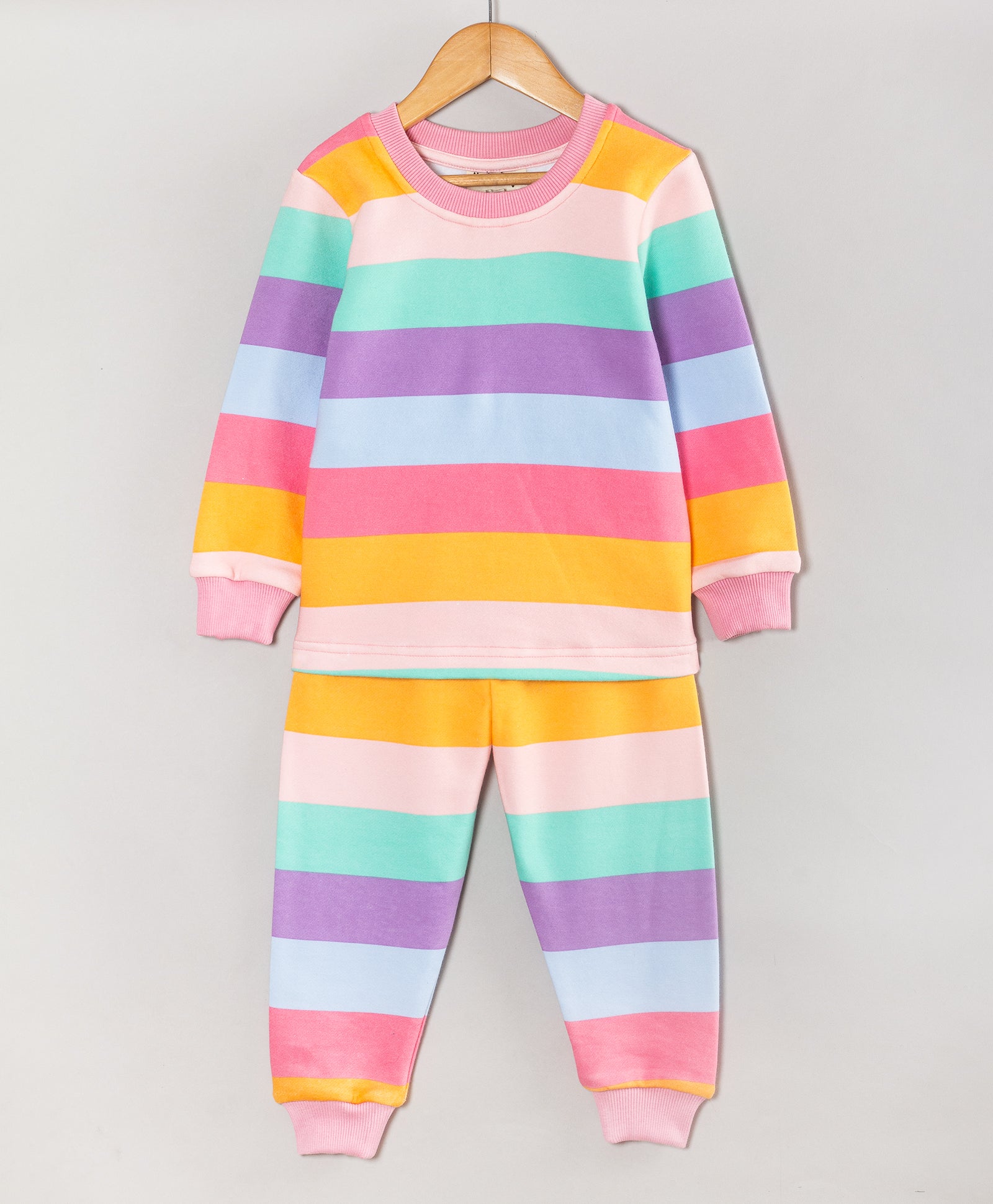 Ribbed detailing at neck, cuffs and pants end.